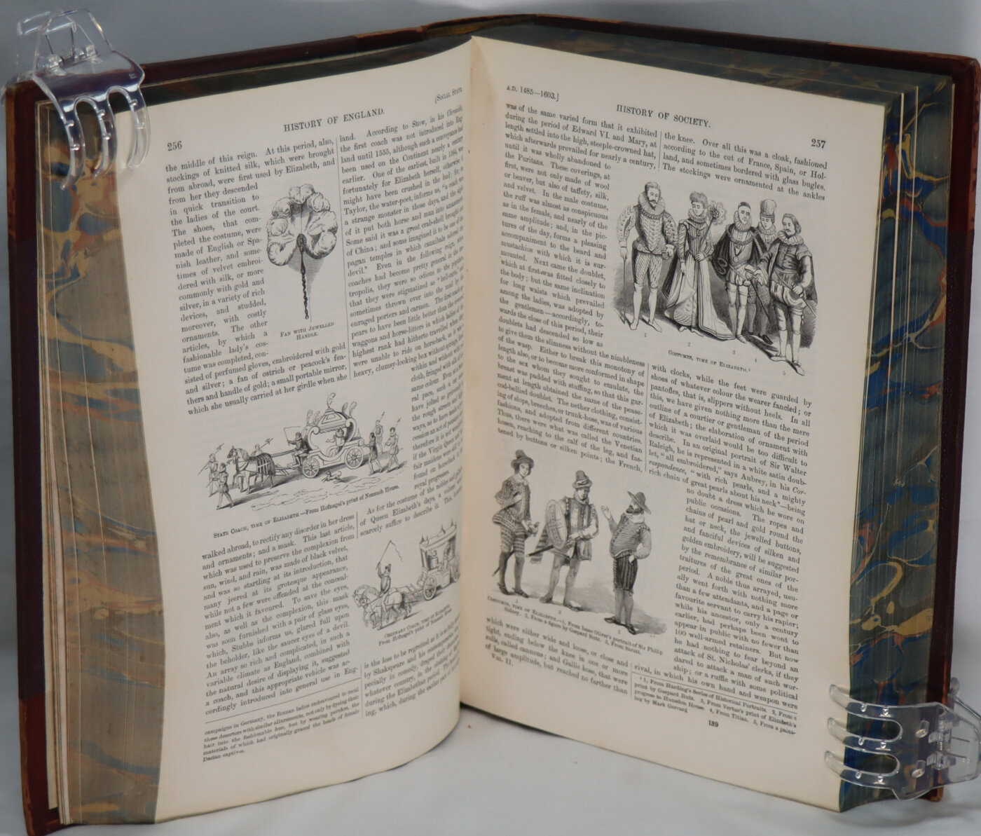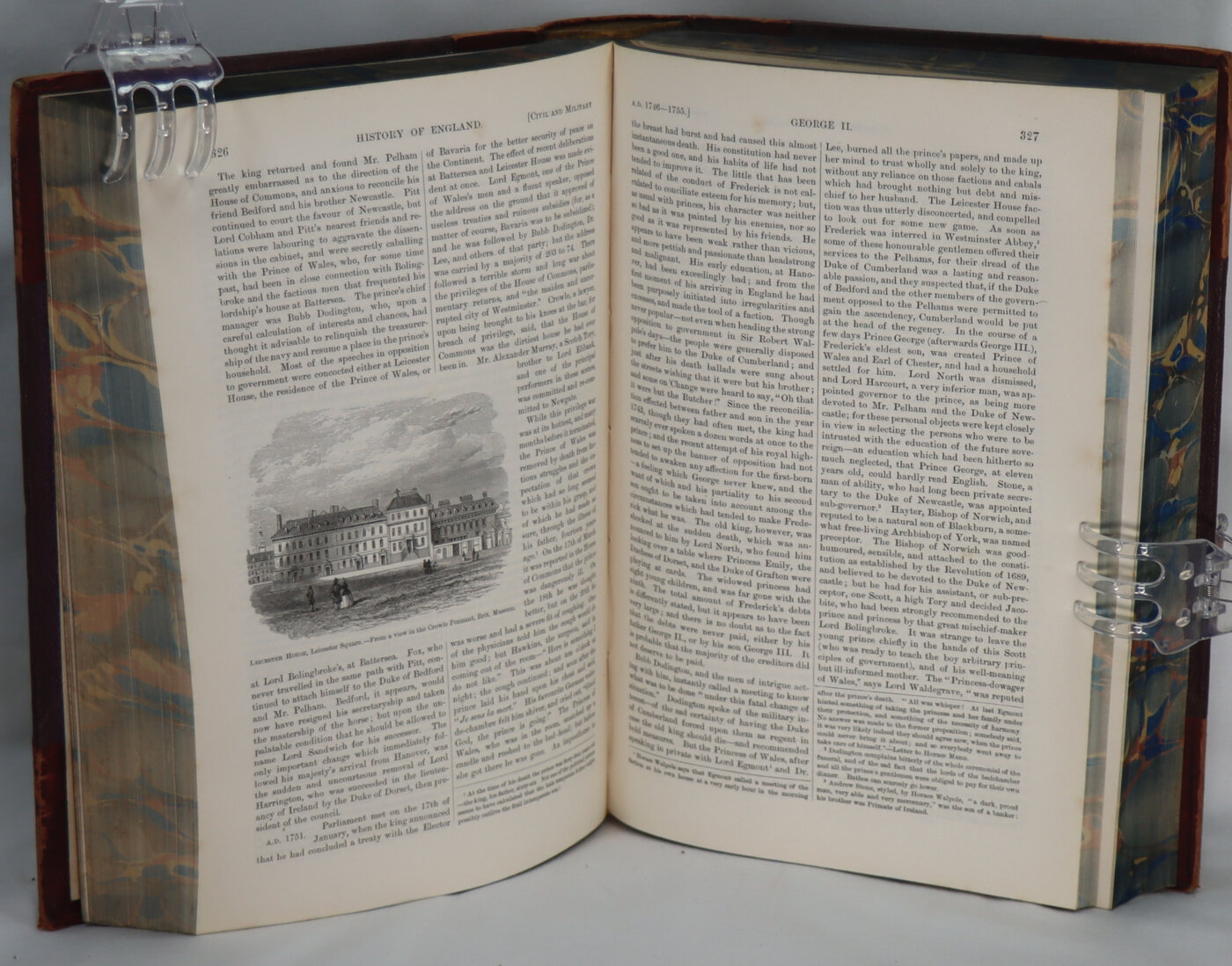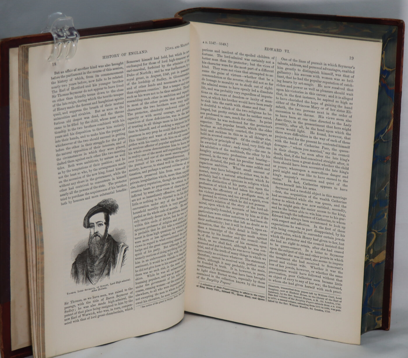 Maroon calf spine (faded to tan) with black title plate, gilt banding and title. Maroon cloth boards. Dimensions are for one volume.