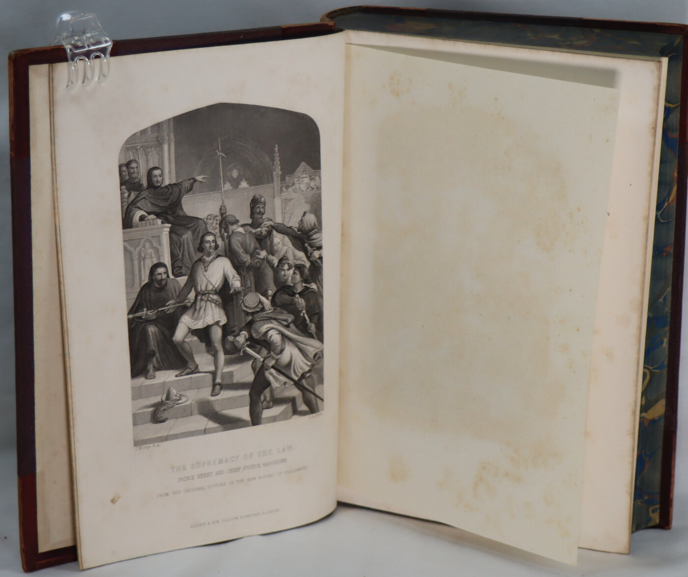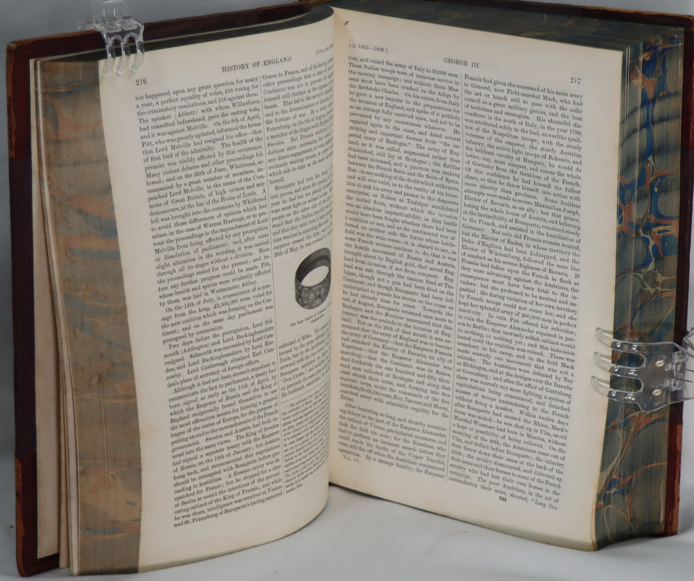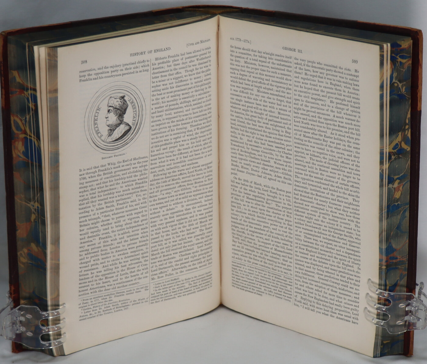 Maroon calf spine (faded to tan) with black title plate, gilt banding and title. Maroon cloth boards. Dimensions are for one volume.