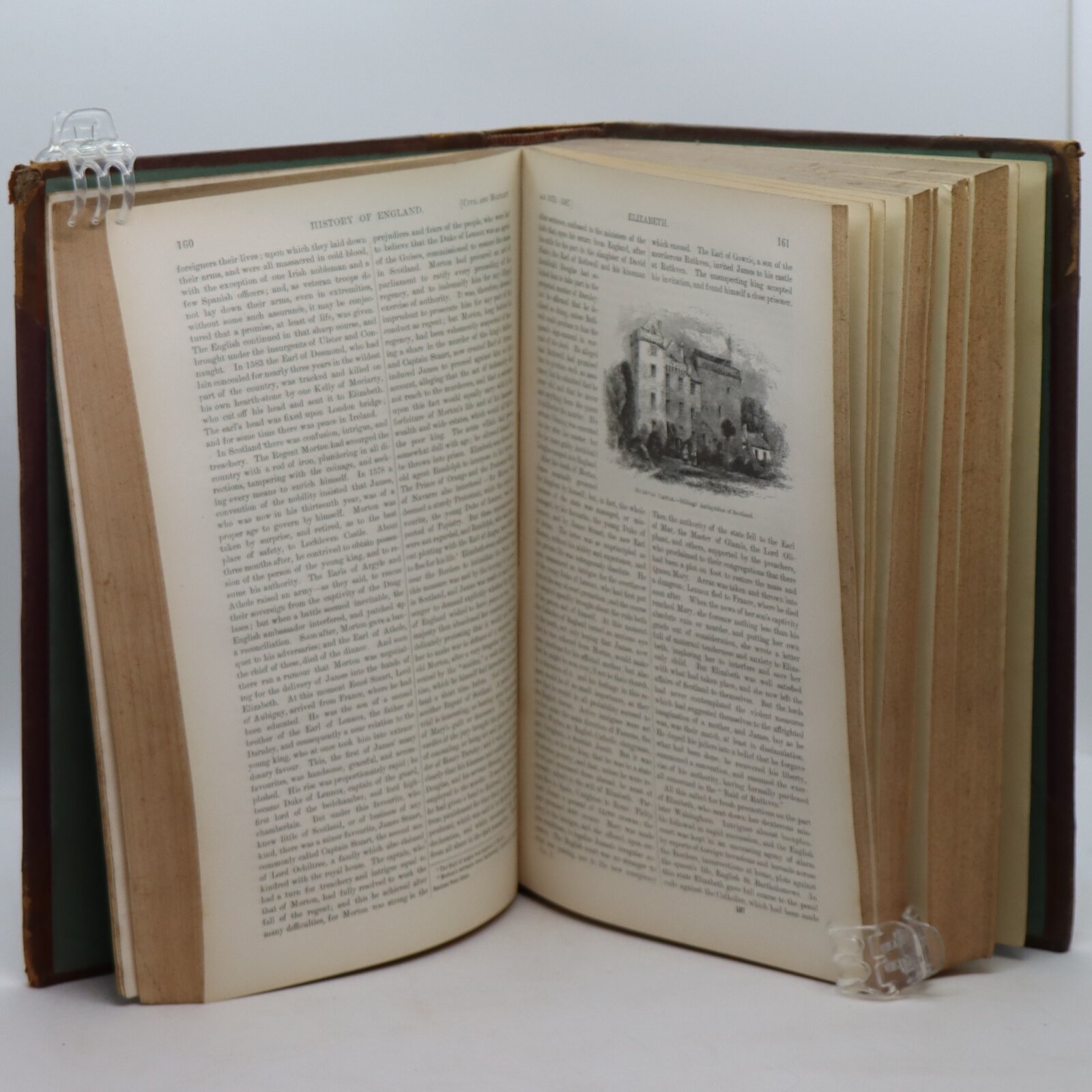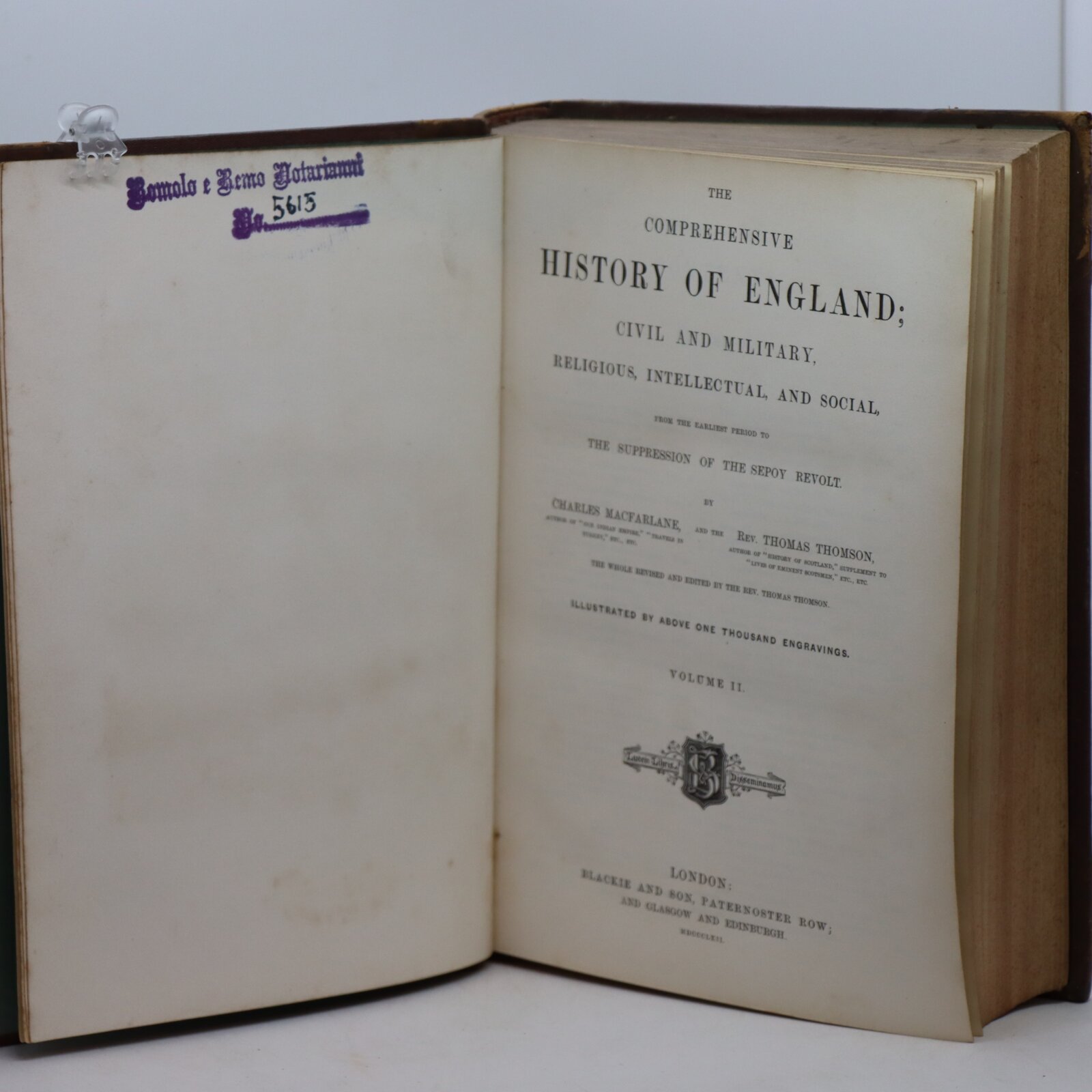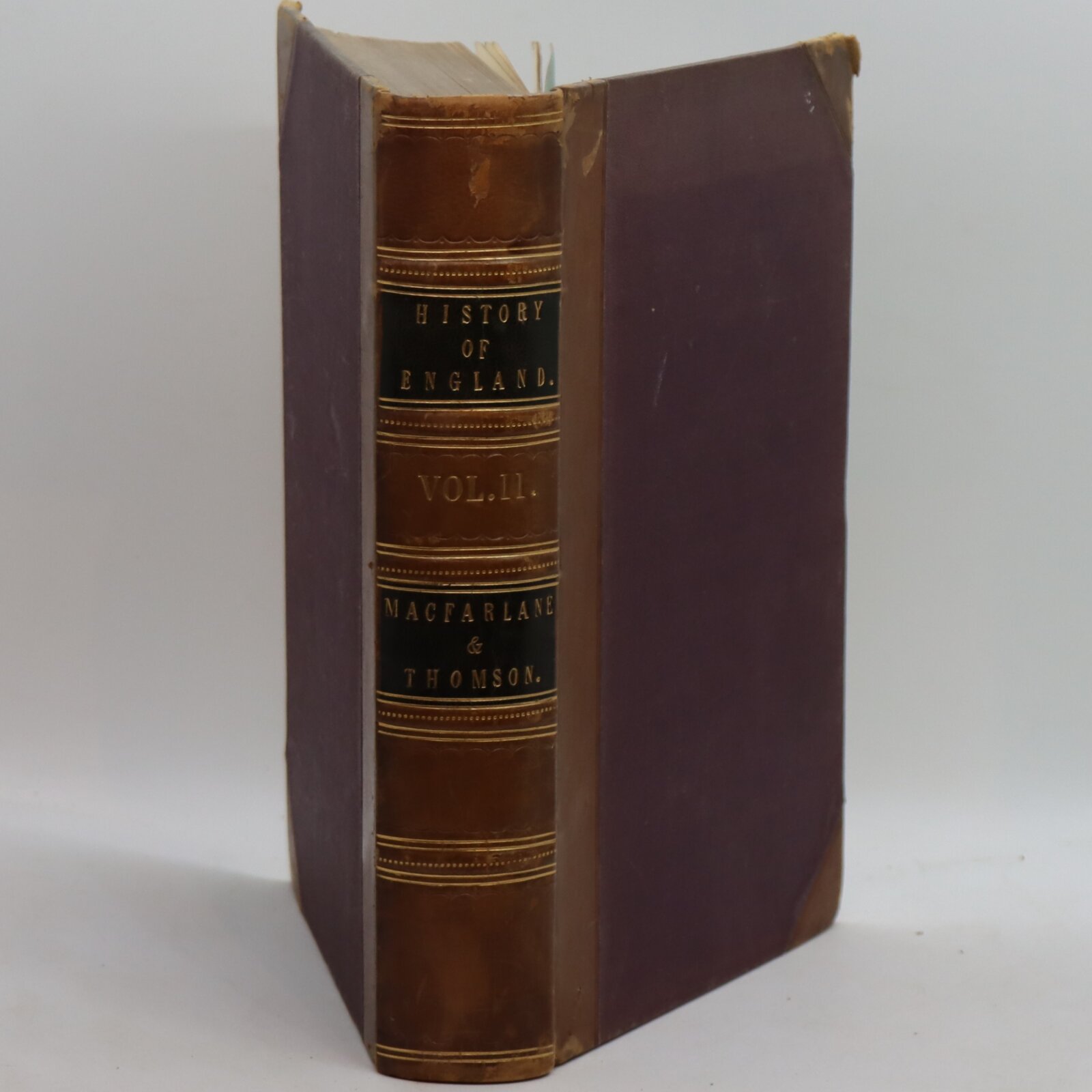 Tan leather spine. Purple boards. Black title plates with gilt lettering and banding on the spine.
