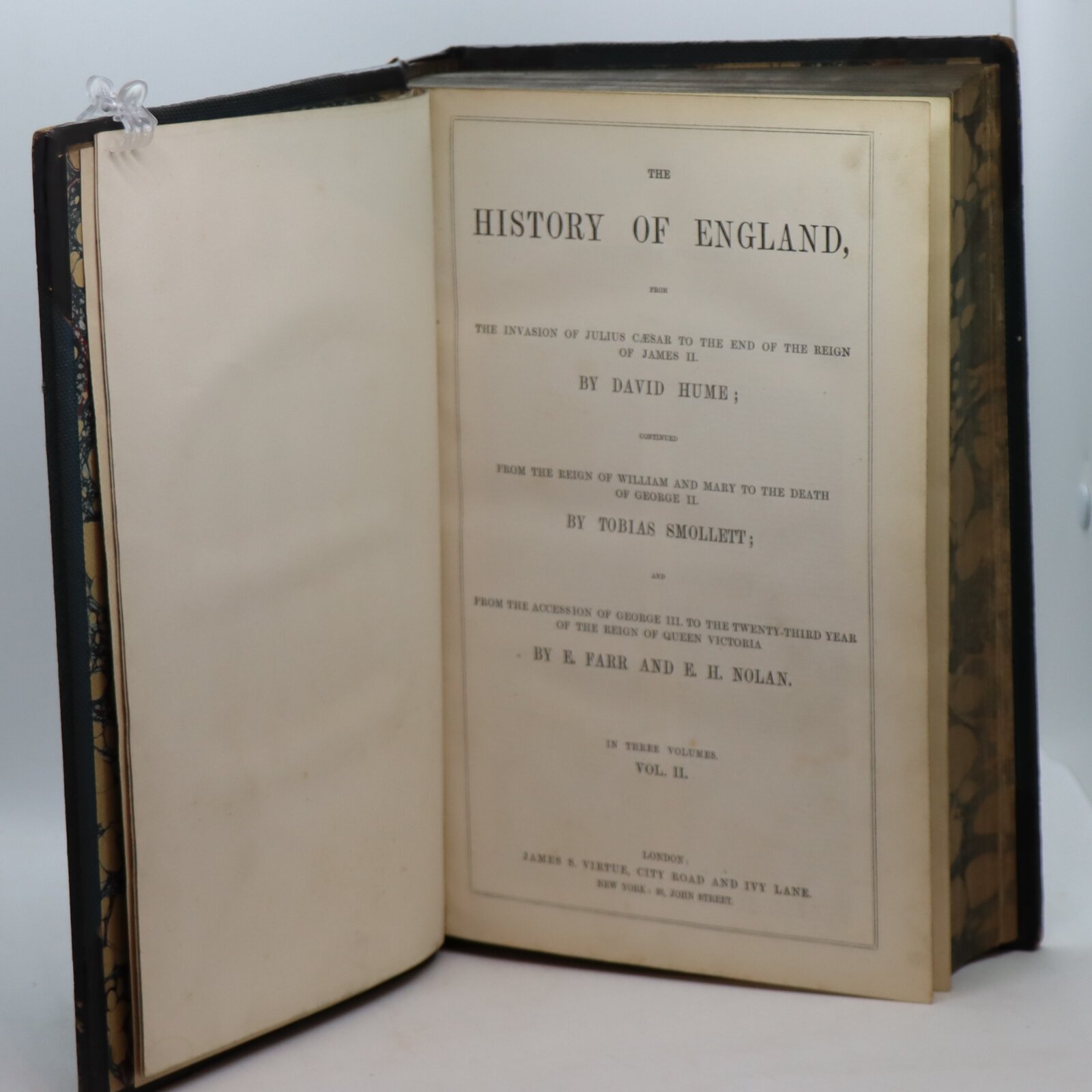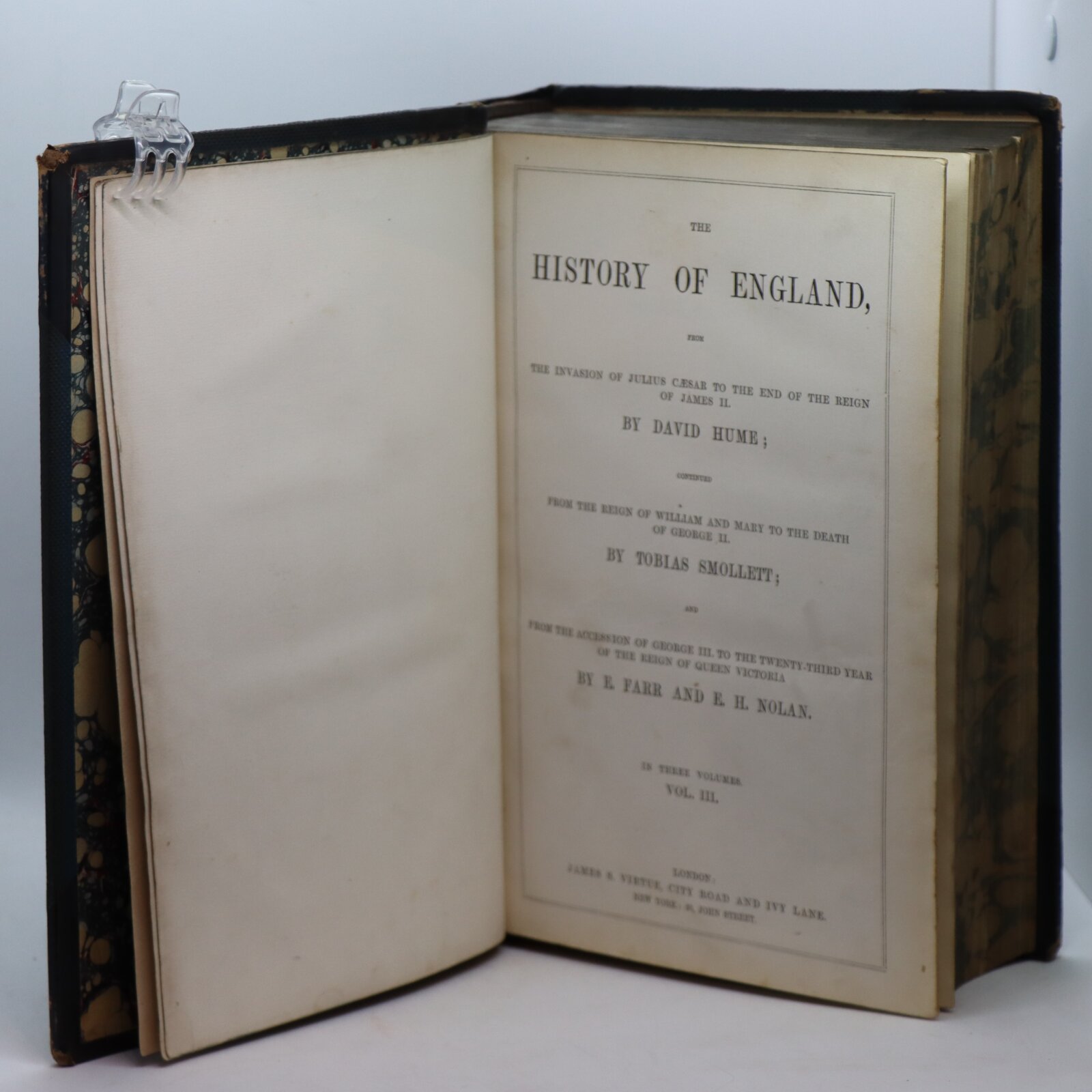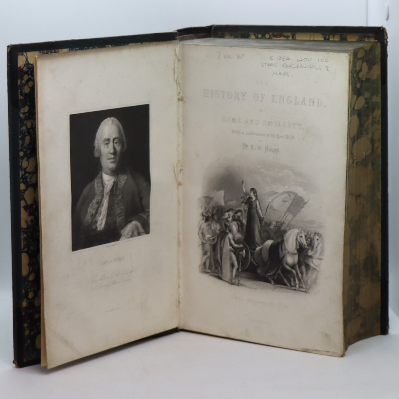 A very clean three volume history of England written by David Hume and Tobias Smollett, lavishly illustrated with plates and maps. First appearing between 1754 and 1761, this History of England was David Hume’s magnum opus, held as the standard history of England in its day and running over one hundred editions. Hume’s contribution began with Caesar’s invasion and finished with the Revolution of 1688; Smollett’s continued from the reign of William and Mary until the death of George II, and E. Farr and E. H. Nolan covered the accession of George III until the thirty-sixth year of the reign of Queen Victoria. David Hume (1711-1776) was a philosopher and writer of the Scottish Enlightenment. Continued by Tobias Smollett (1721-1771), a writer and historian known for his picaresque works; he published a supplement volume to the original work between 1760 and 1765.Lavishly illustrated throughout with plates engraved on steel, as well as an illustrated frontispiece and half-title page to each volume.