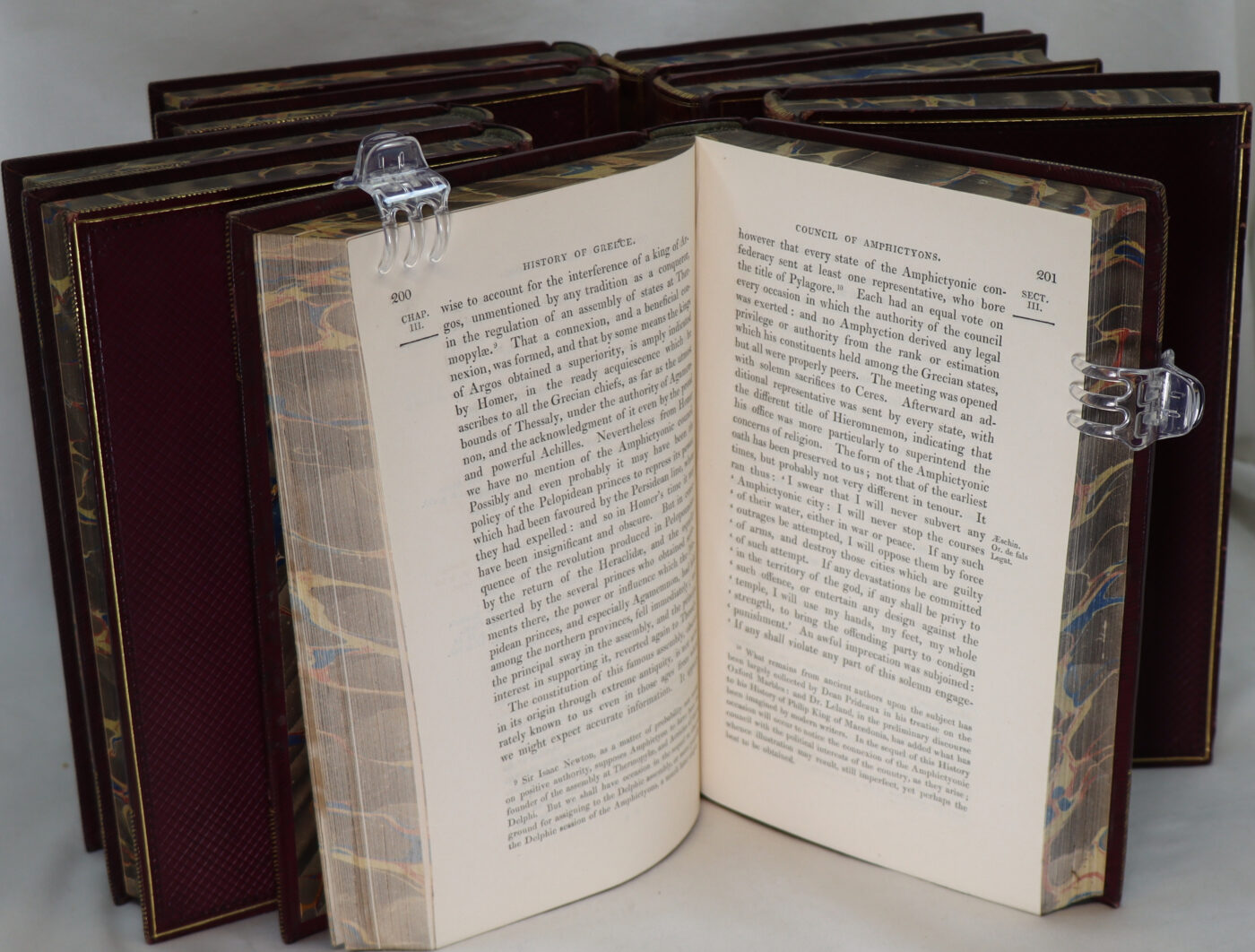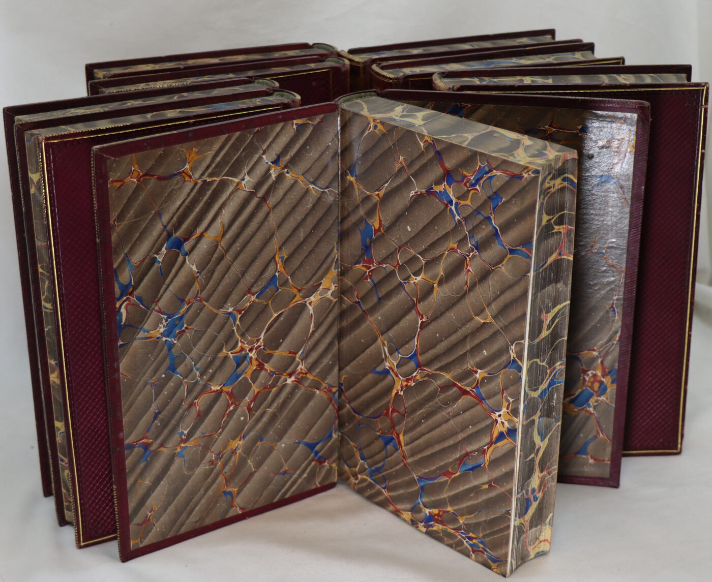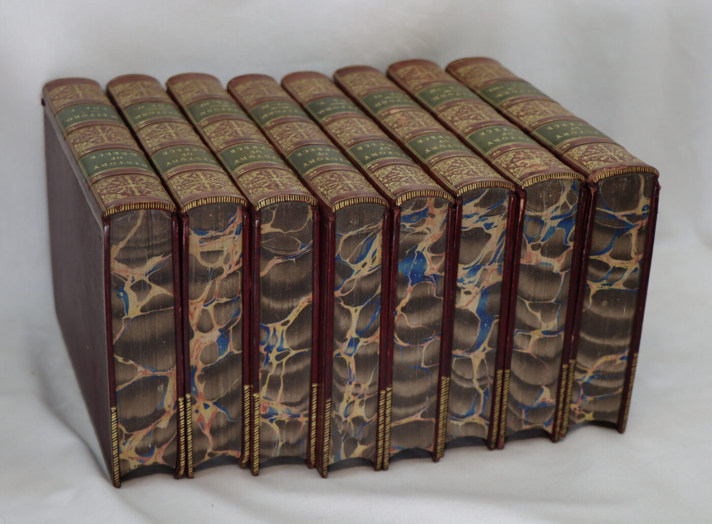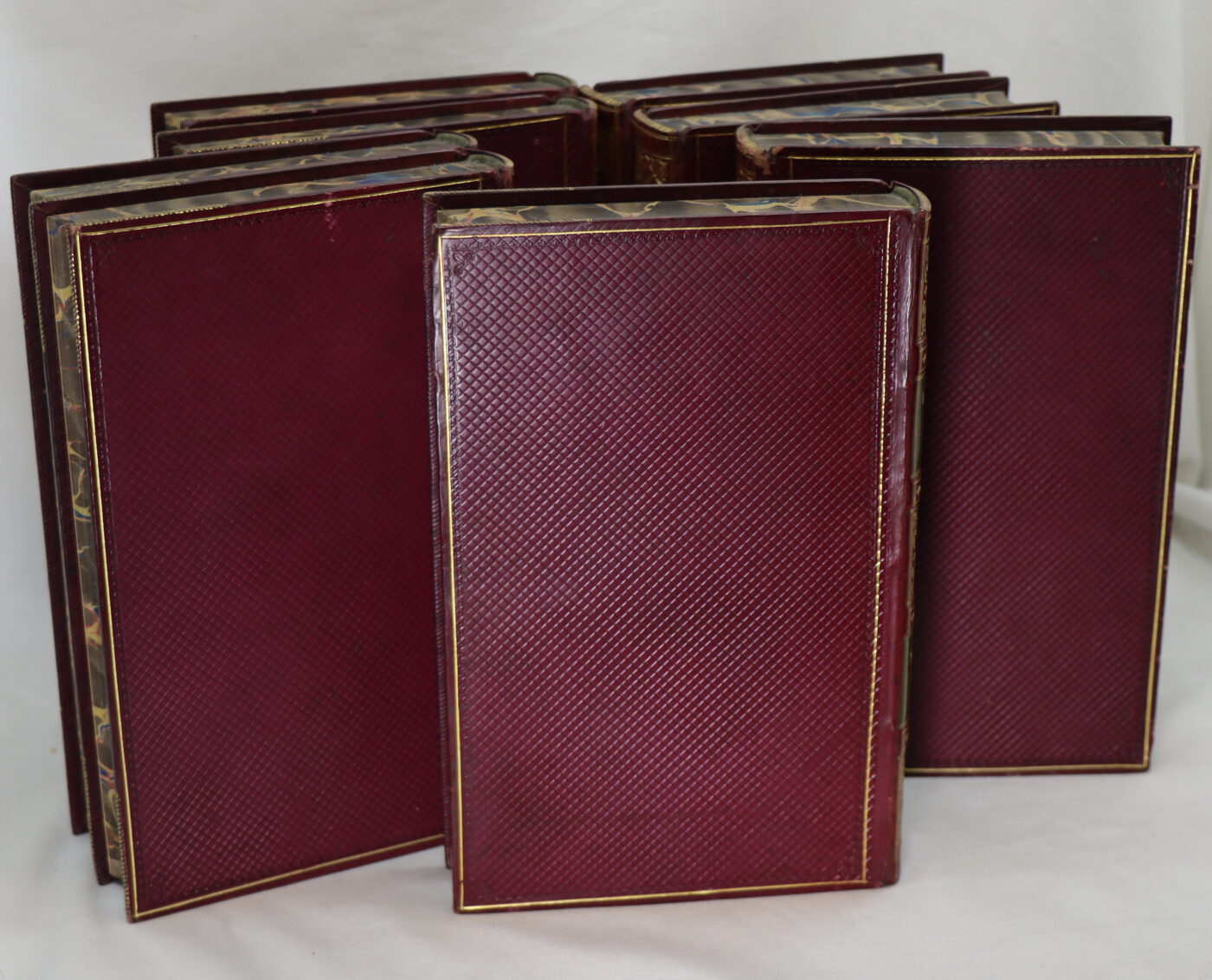 Maroon leather binding with green title plates, Gilt banding, decoration and title on the spine. Embossed cross hatcheding on both boards. Volumes I, II, III, IV, V, VI, VII, and VIII.