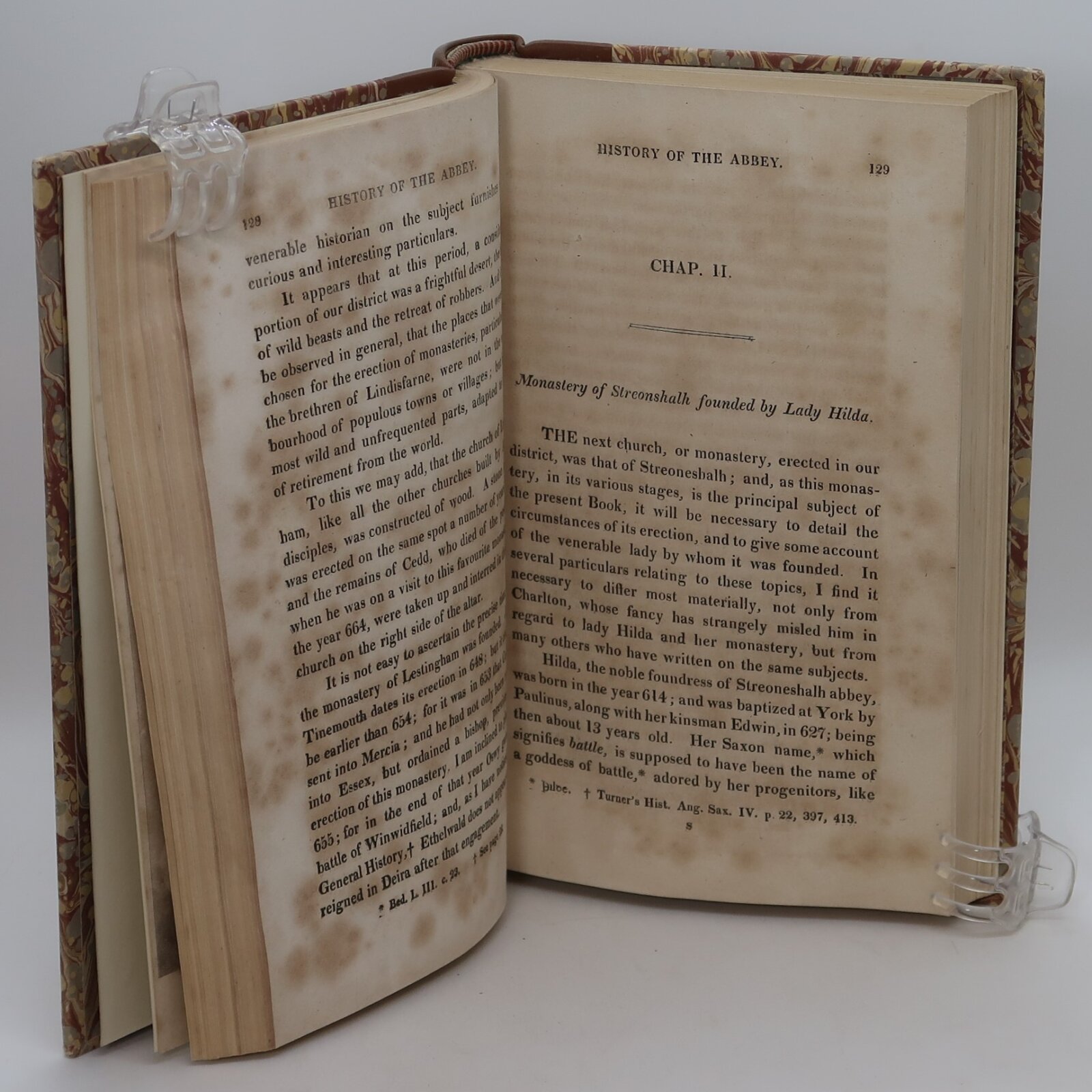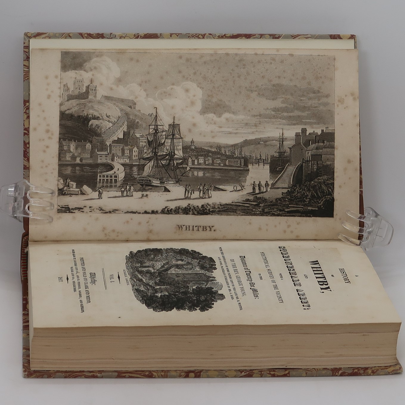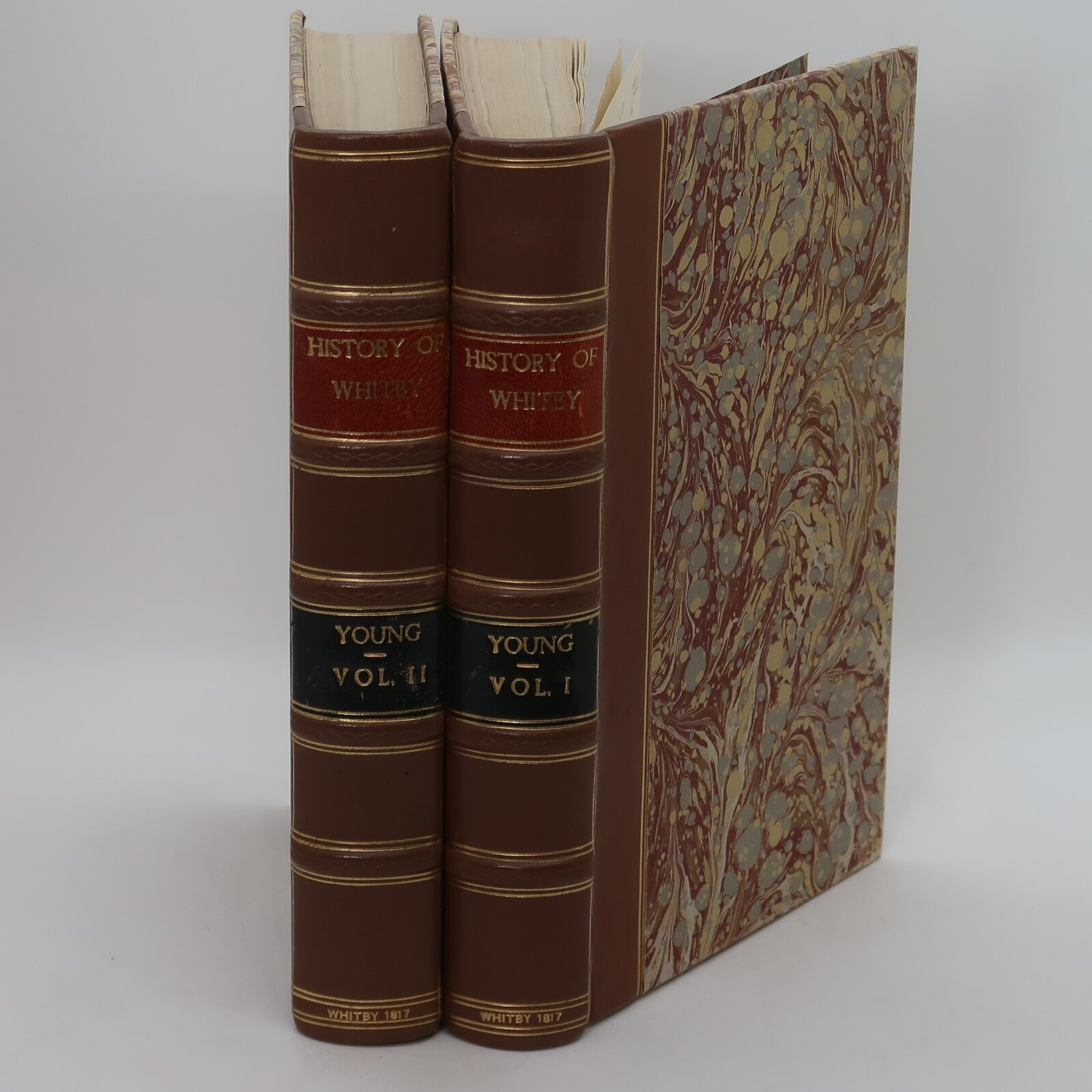 Light brown spine with brown marbled boards. Red and black names plates with gilt lettering and lines. Dimensions are for one volume.