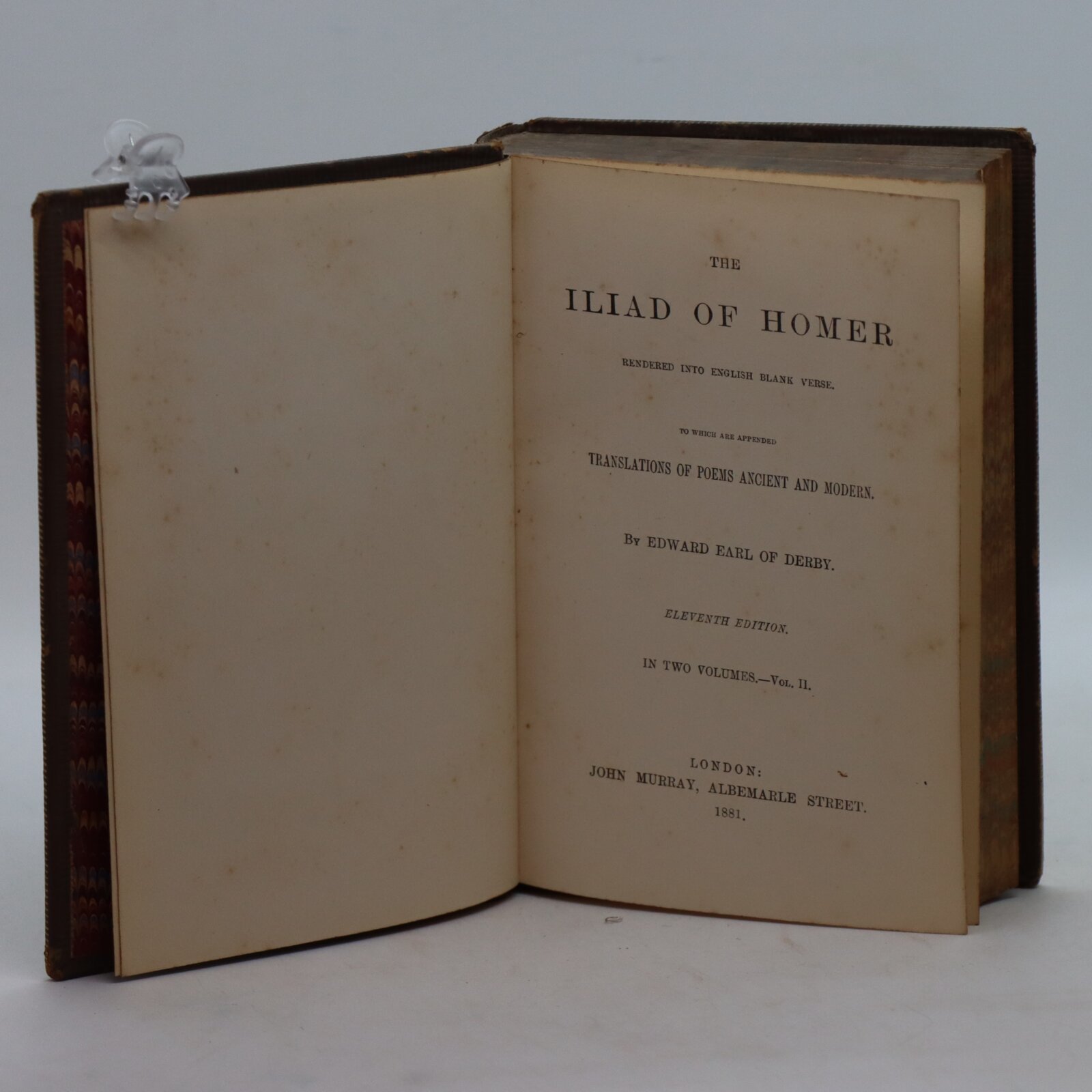Edward Stanley, fourteenth earl of Derby (1799-1869), British statesman. Three times Conservative prime minister, Derby spent 22 years as leader of the Conservative Party (still an unbroken record). Early in his career, he oversaw the passage of the 1833 Slavery Abolition Act (which abolished slavery in some parts of the British Empire); also in the 1830s, he was responsible for the passage of the 1832 Irish Education Act. In his third term as prime minister he presided over the passage of the 1867 Reform Act, which greatly expanded suffrage for British men, effectively doubling the size of the electorate: ‘a more extensive measure than Derby had originally conceived’ (ODNB). In in July 1874 his fellow Conservative Disraeli summarized Derby’s career thus: ‘He abolished slavery, he educated Ireland, he reformed parliament’. A proponent of ‘moderate judicious reform’, between ‘1846 and 1868 he restored the Conservatives as a credible party of government’ (ODNB). Stanley was an accomplished classical scholar and translator: his translation of Homer’s Iliad first appeared in 1864 (this edition) ‘to much critical praise’ (ODNB); by 1867, it had reached its sixth edition.