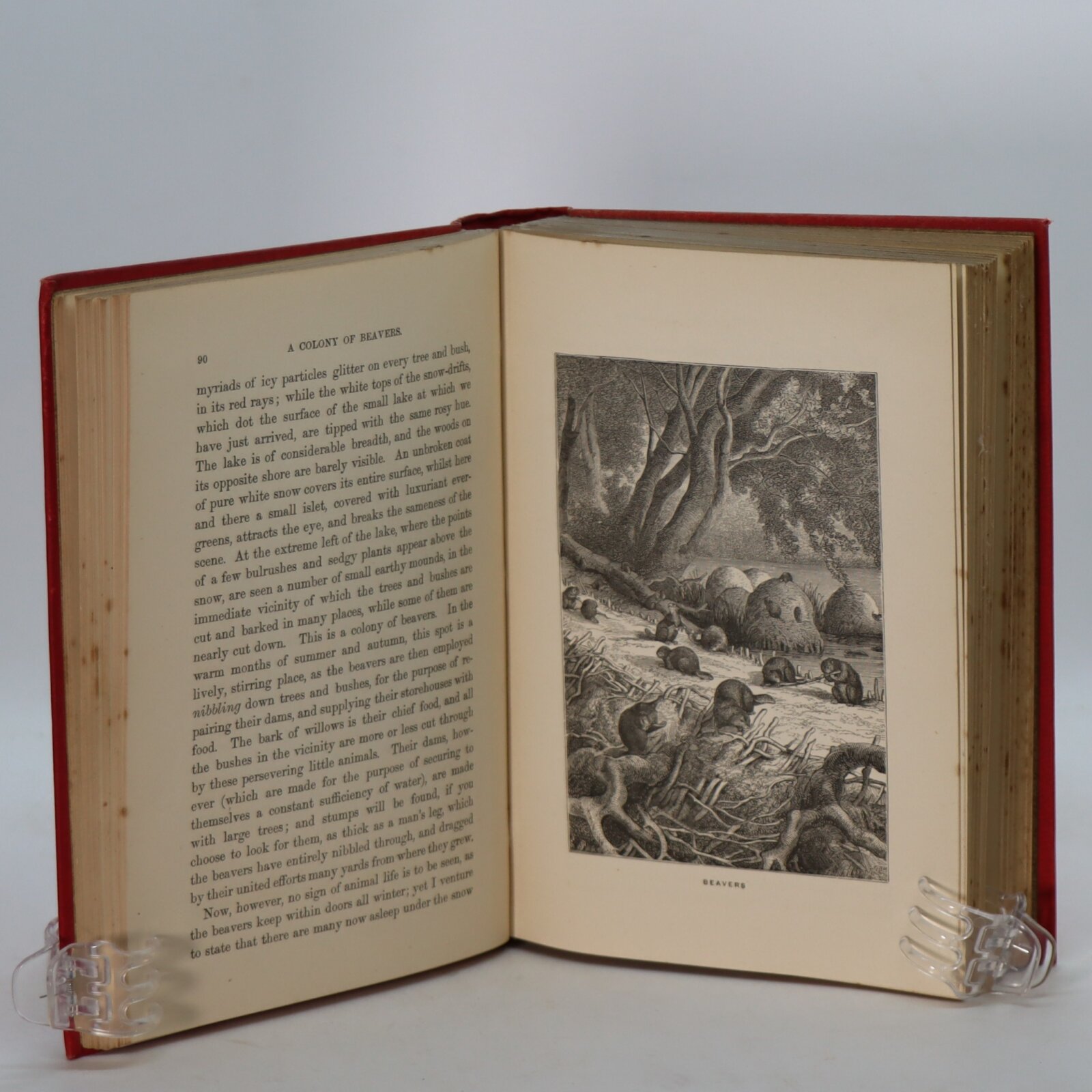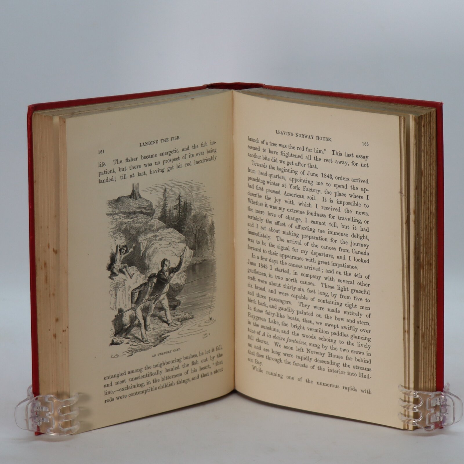 Red cloth binding with gilt and black title and canoeing image on the front board. Gilt title and snowshoed figure on the spine.