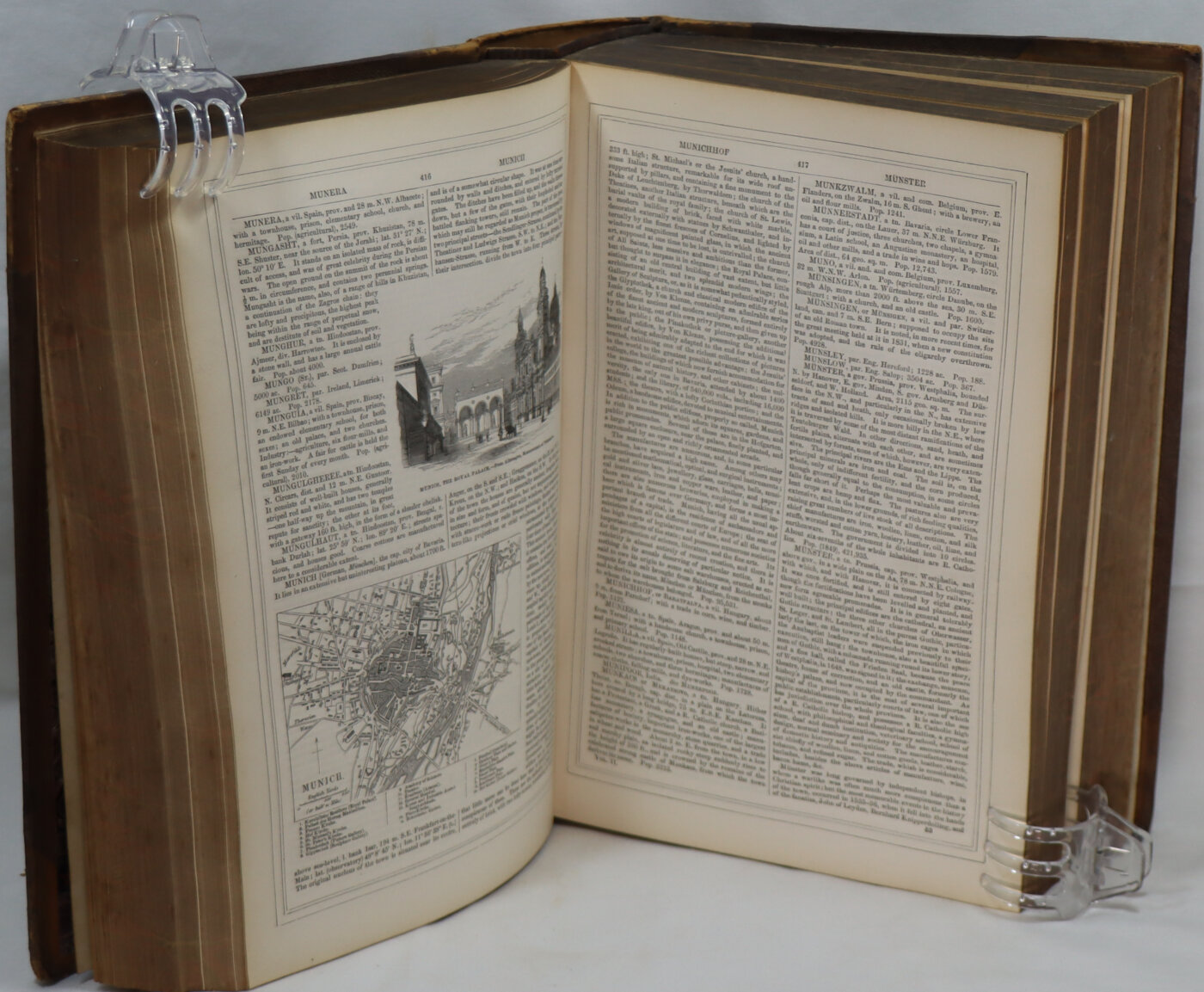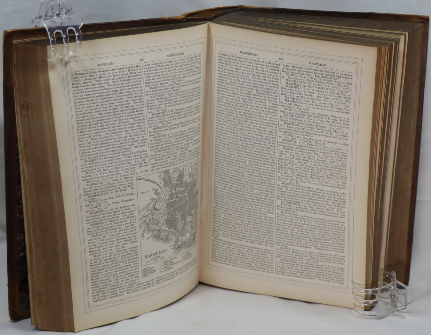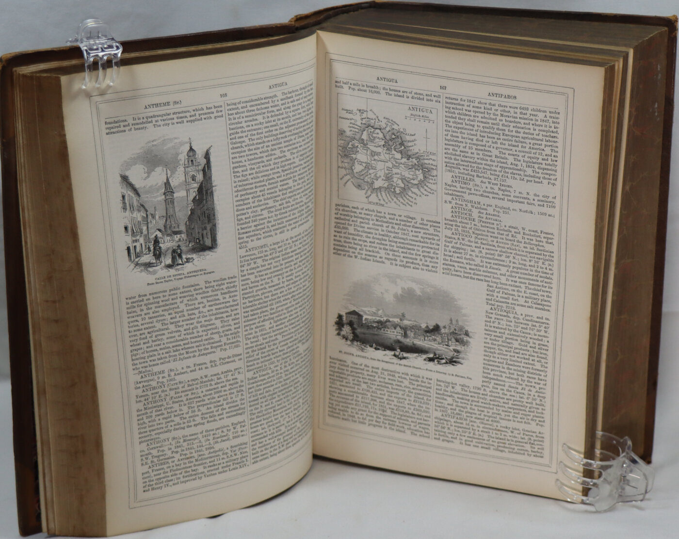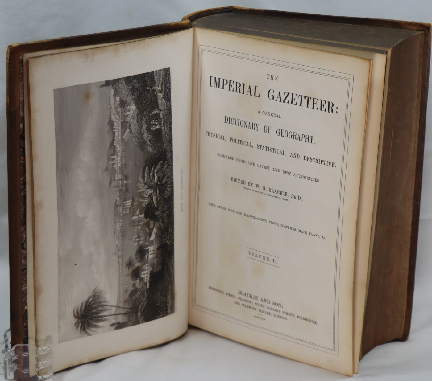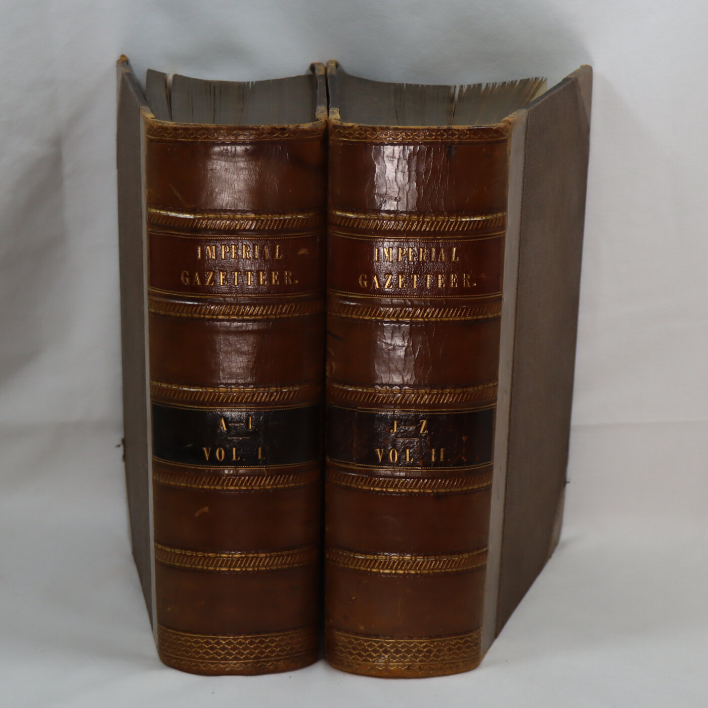 The imperial gazetteer; a general dictionary of geography, physical, political, statistical, and descriptive. [complete in 2 volumes]. Very good volumes bound in contemporary leather over boards. Gilt-blocked leather spine labels, with raised bands. Slight dulling and rubbing to the spine and panel edges. All edges marbled. Marbled endpapers. Remains particularly well-preserved overall; tight, bright, clean and strong. Further scans, images etc. and additional bibliographical material available on request.
