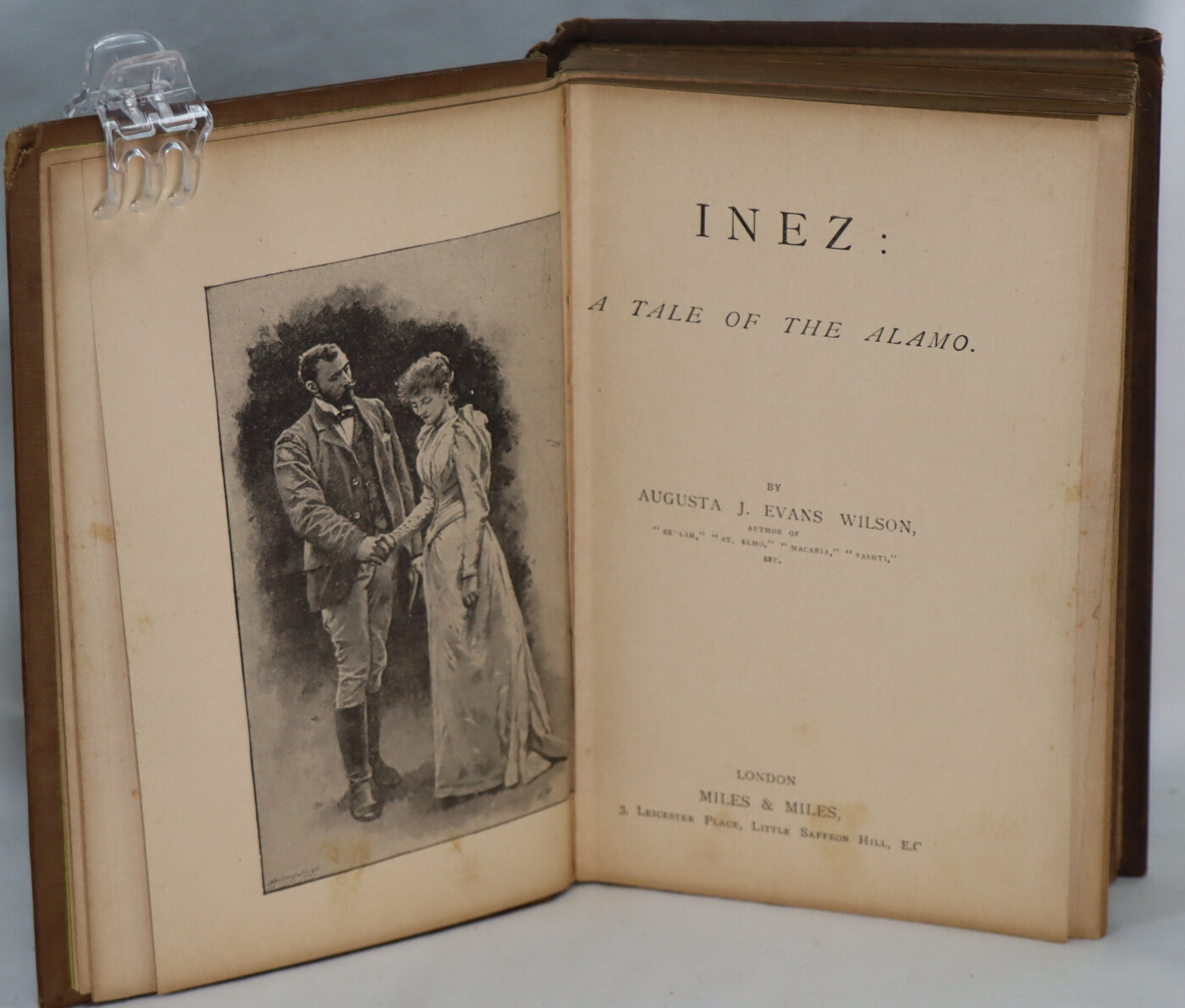 Inez is a mid-Victorian great girls story centered on the Alamo written by Augusta Jane Wilson (nee Evans). In 1850, at the age of fifteen, she wrote Inez: A Tale of the Alamo, a sentimental, moralistic, and anti-Catholic love story. It told the story of one orphan’s spiritual journey from religious skepticism to devout faith. She presented the manuscript to her father as a Christmas gift in 1854. It was published anonymously in 1855.