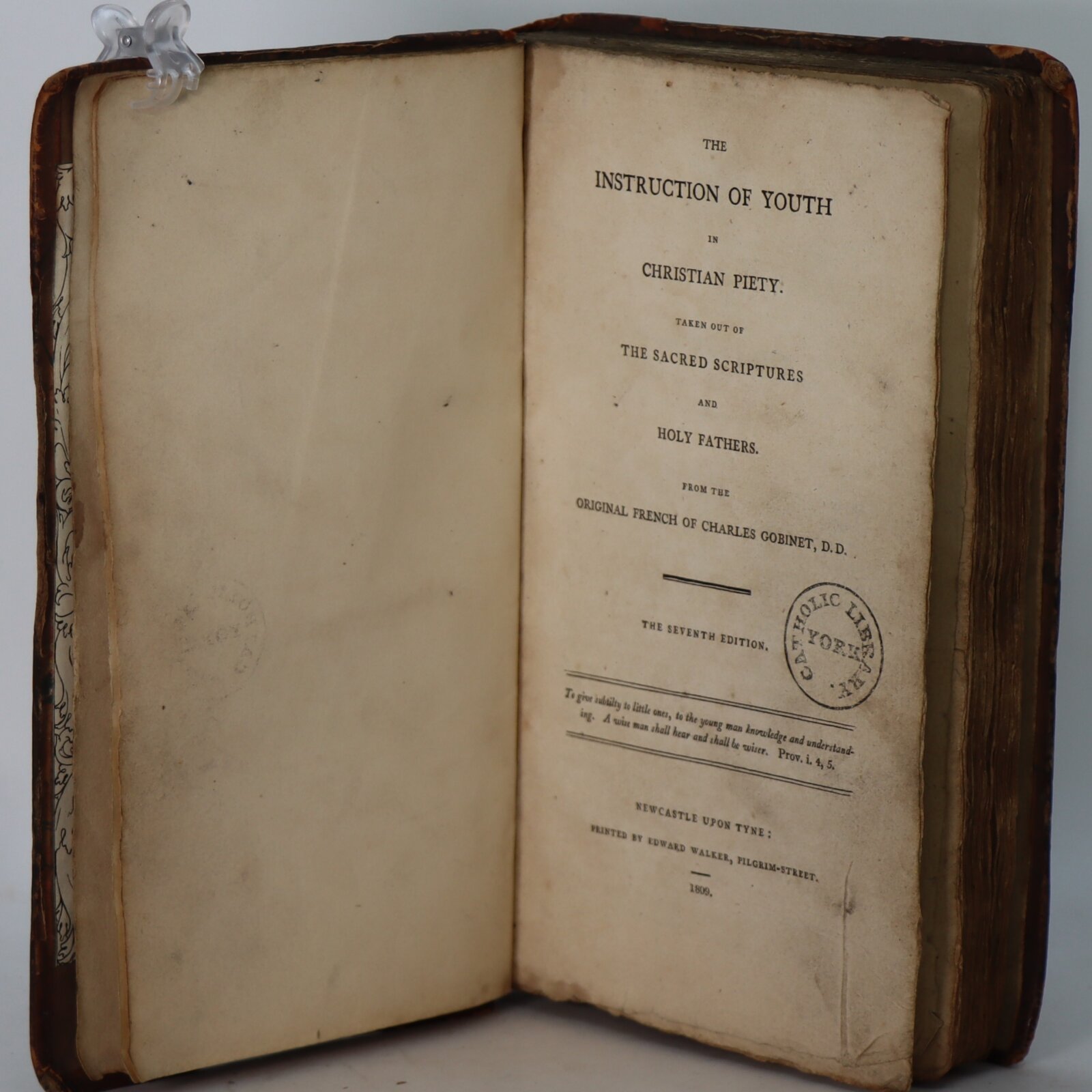 Instruction of Youth in the Christian Pieta, From the Holy Scripture, from Saints Peres. Divided into five parts. By Mr. Charles Gobinet, Priest, Doctor in Theology, of the Maison Societé de Sorbonne: Principal of the College du Plessis-Sorbonne. Ut detur parvulis astutia: Adolescenti scientia intellectus. Prov. I. Acev an Instruction for Meditation. New edition Very exactly revised, corrected. In Leuven, at Jean Francois van Overbeke, at the Lampe d’Or. 1763. With approval & privilege.