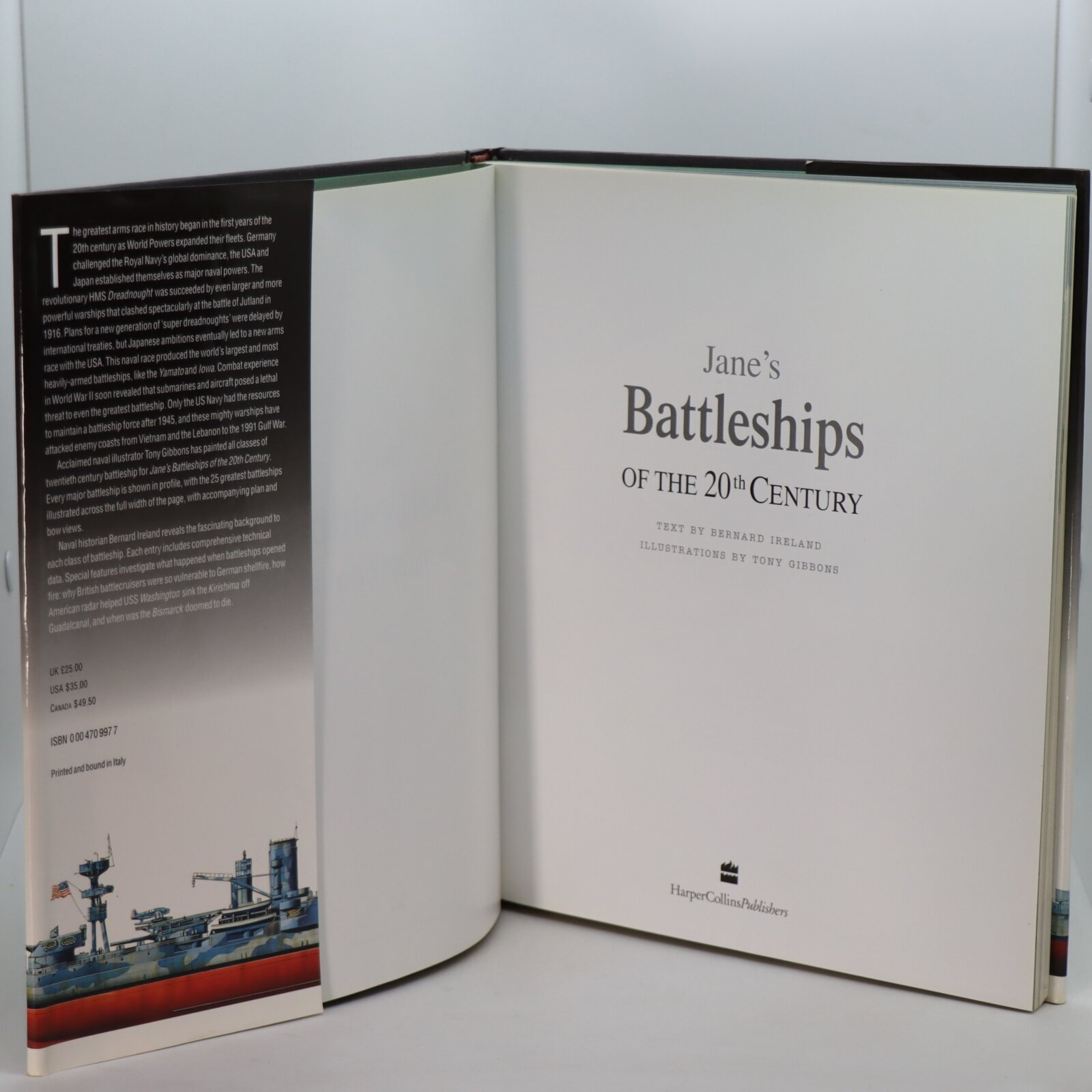 The greatest arms race in history began in the first years of the 20th century as World Powers expanded their fleets. Germany challenged the Royal Navy’s global dominance, the U.S. and Japan established themselves as major naval powers. The revolutionary HMS Dreadnought was succeeded by even larger and more powerful warships that clashed spectacularly at the battle of Jutland in 1916. Plans for a new generation of ‘super dreadnoughts’ were delayed by international treaties, but Japanese ambitions eventually led to a new arms race with the U.S.. This naval race produced the world’s largest and most heavily armed battleships, like the Yamato and Owa. Combat experience in World War II soon revealed that submarines and aircraft posed a lethal threat to even the greatest battleship. Only the U.S. Navy had the resources to maintain a battleship force after 1945, and these mighty warships have attached enemy coasts from Vietnam and the Lebanon to the 1991 Gulf War. Acclaimed naval illustrator Tony Gibbons has painted all classes of twentieth century battleship for Jane’s Battleships of the 20th Century. Every major battleship is shown in profile, with the 25 greatest battleships illustrated across the full width of the page, with accompanying plan and bow views. Naval historian Bernard Ireland reveals the fascinating background to each class of battleship. Each entry includes comprehensive technical data. Special features investigate what happened when battleships opened fire: Why British battle cruisers were so vulnerable to German shellfire, how American radar helped USS Washington sink the Kirishiman off Guadalcanal and when was the Bismarck doomed to die.