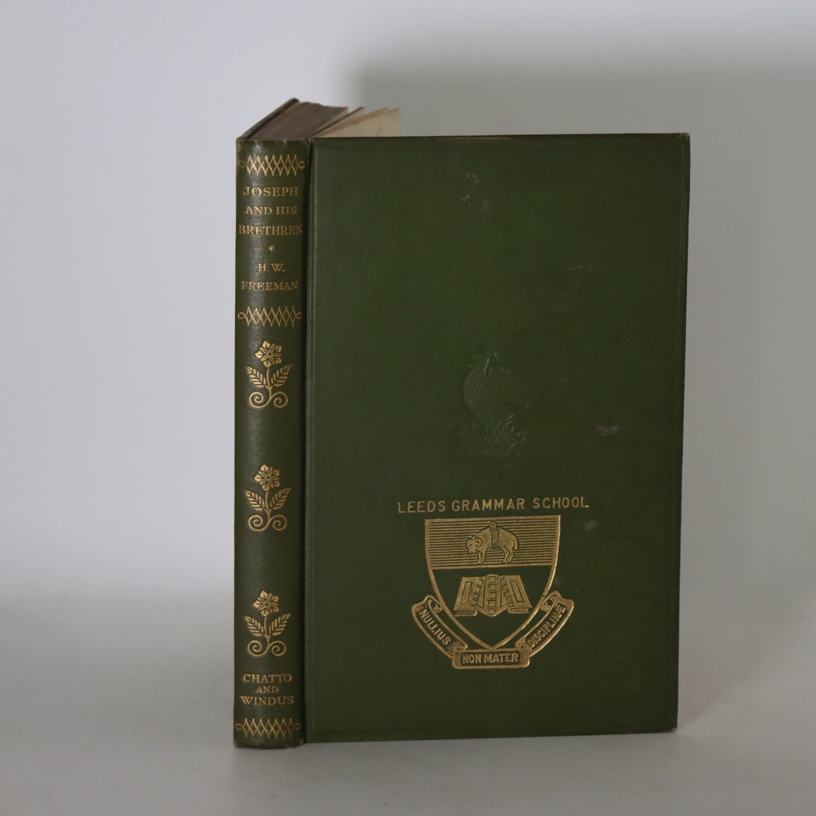Green cloth binding with gilt title and design the spine. and front board. Leeds Grammar School emblem on the front board.
