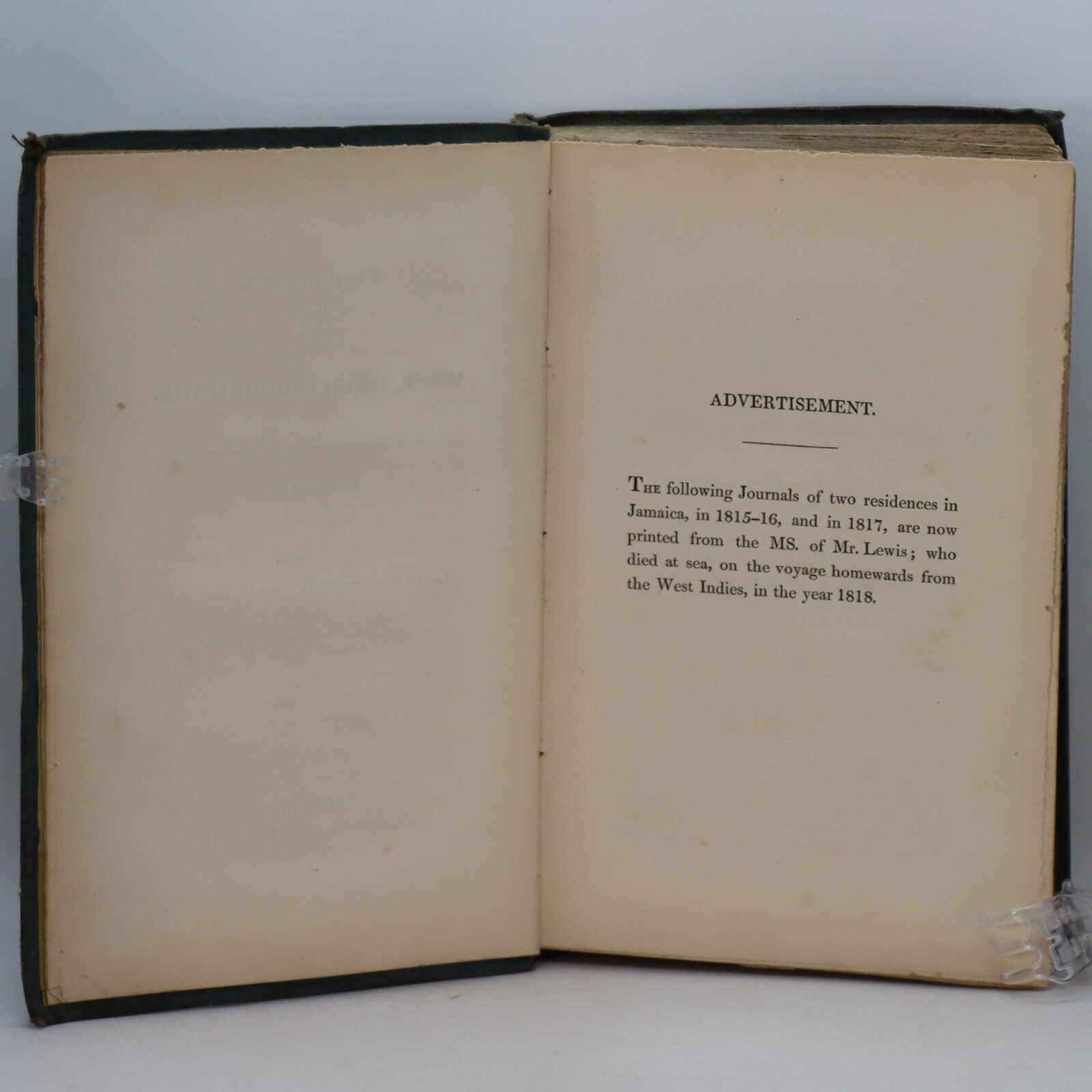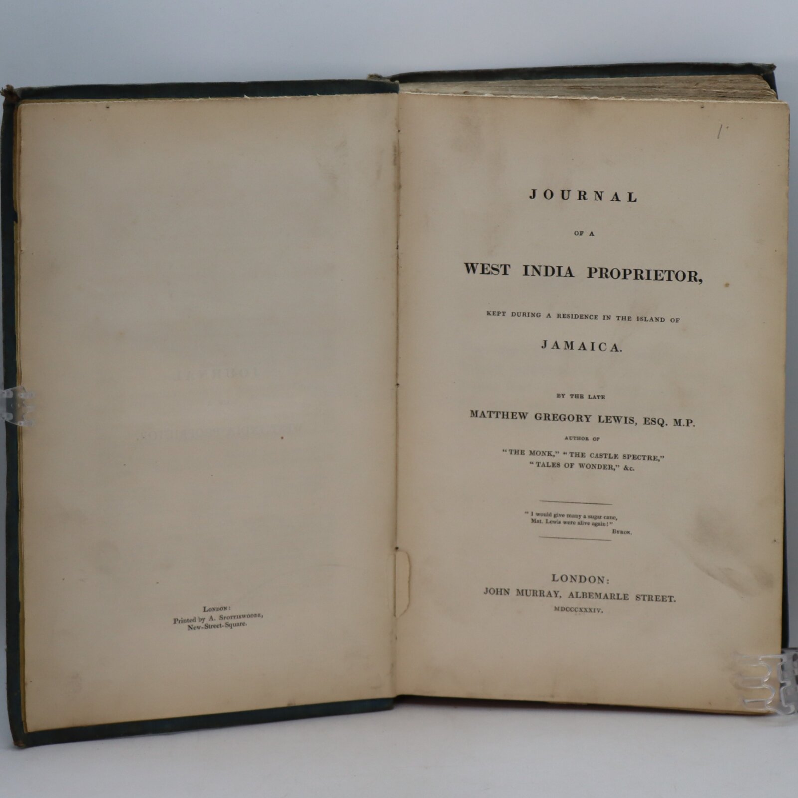 Journals of “Monk” Lewis’ two residences in Jamaica, in 1815-1816 and in 1817. Printed from the manuscript. The author died at sea while returning to England in 1818. NCBEL 3:743; Peck pp. 168-170; Sabin 40821 Original boards. A good copy of this journal by the famous Gothic novelist.