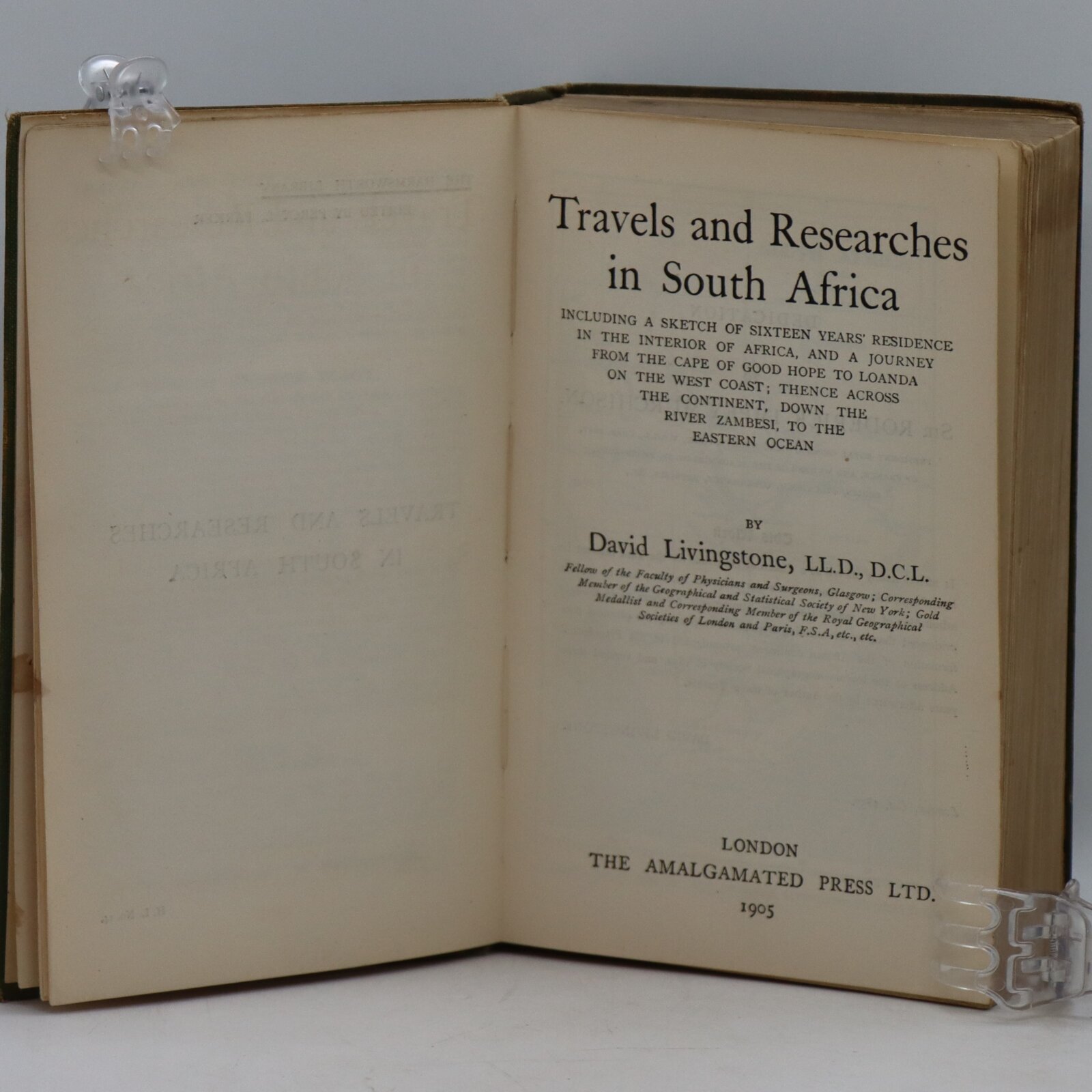 Black and white frontispiece steel engraving, black and white wood engravings, 2 folding maps, xxiv+730pp, 9 1/2 x 6 1/2 inches, embossed cloth covered boards (hardbound). Wear to covers, tears along spine and fraying to head of spine; previous owner’s name in ink to front endpaper, occasional faint soiling, small Map of South Africa separated in two pieces along middle fold, Map of Dr. Livingstone’s route in very good condition; overall good, clean condition. An extensive account of Livingstone’s travels in South Africa. Amongst the many interesting illustrations is a tipped in double-page wood engraving, a panoramic view of “The Victoria Falls of the Leeambye or Zambesi River, Called by the Natives Mosyoatunyo (Smoke-Sounding)”; the two John Arrowsmith maps are “Map of south Africa” and “Map of Dr. Livingstone’s Route”.