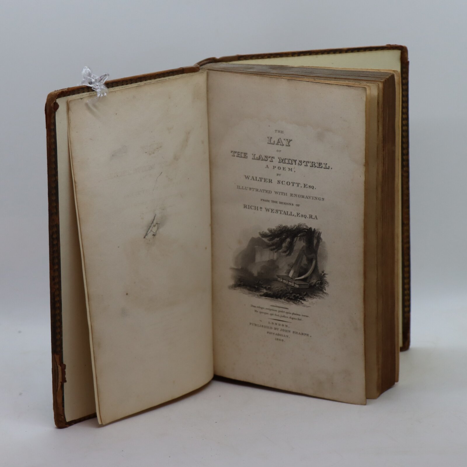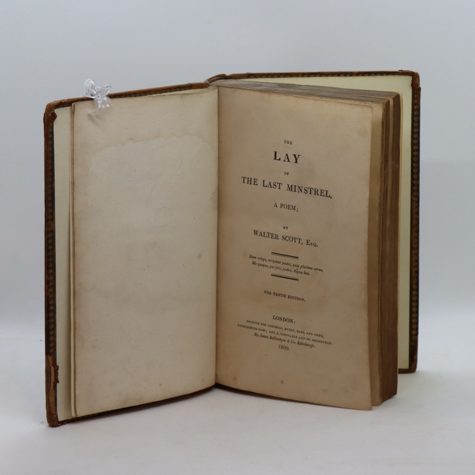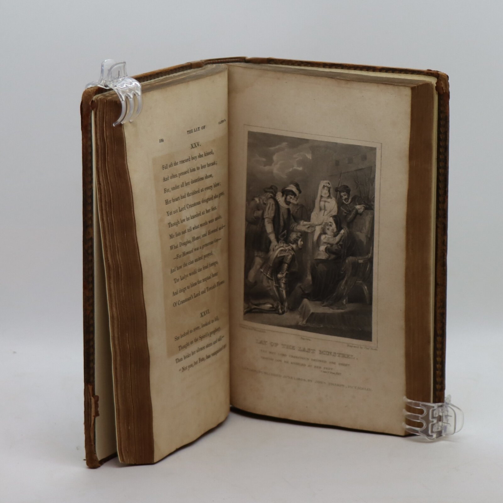 Tan leather binding with gilt board edging. Green title plate with gilt banding and lettering on the spine.