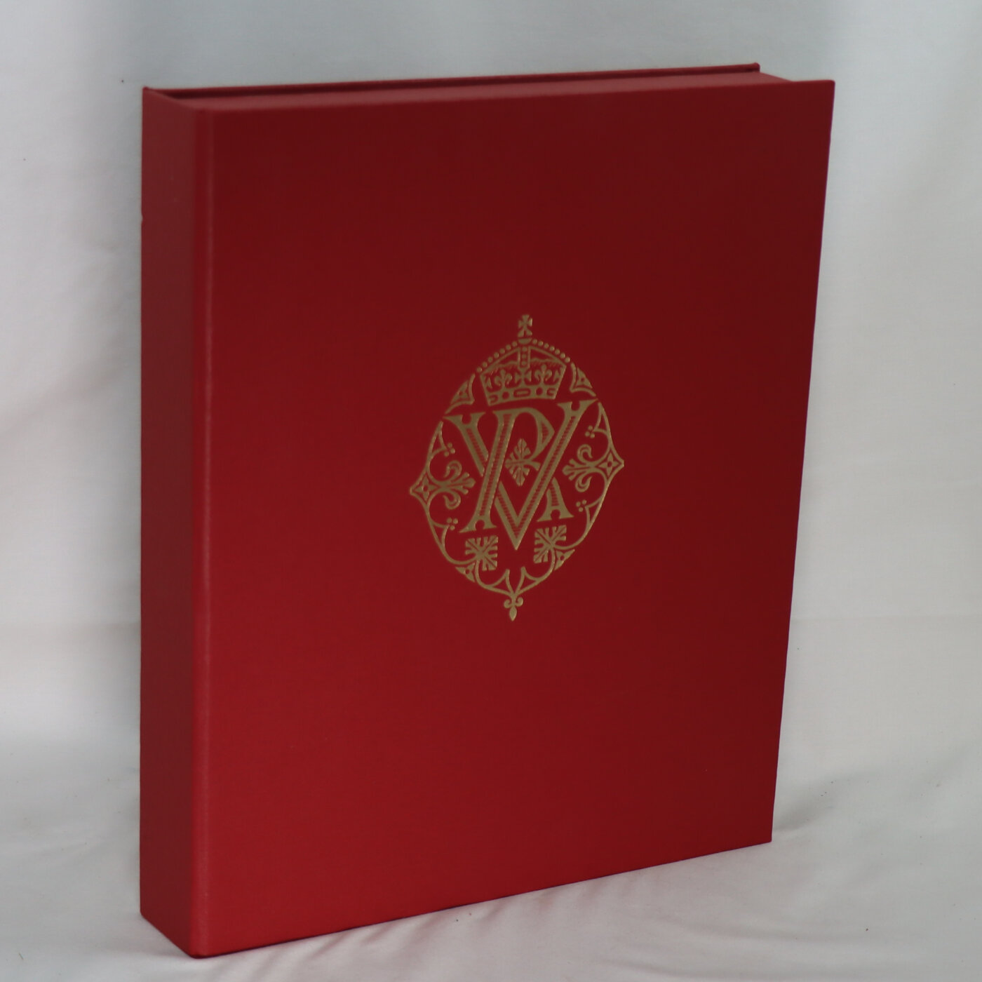 In a fitted box. Red cloth binding with gilt and black decoration and title on the spine and front board. All edges gilt. Dimensions are for the box.