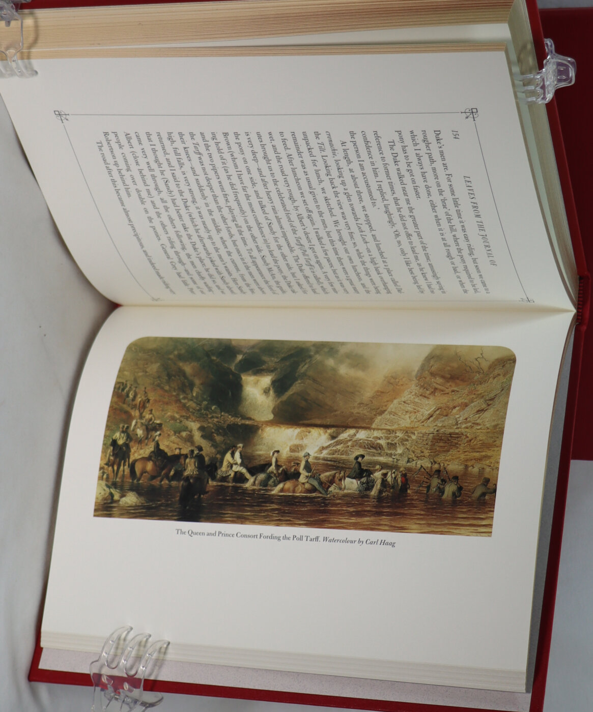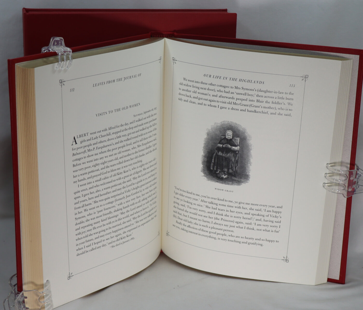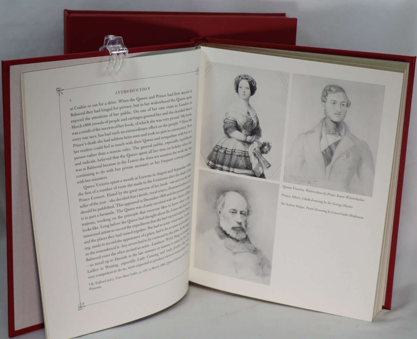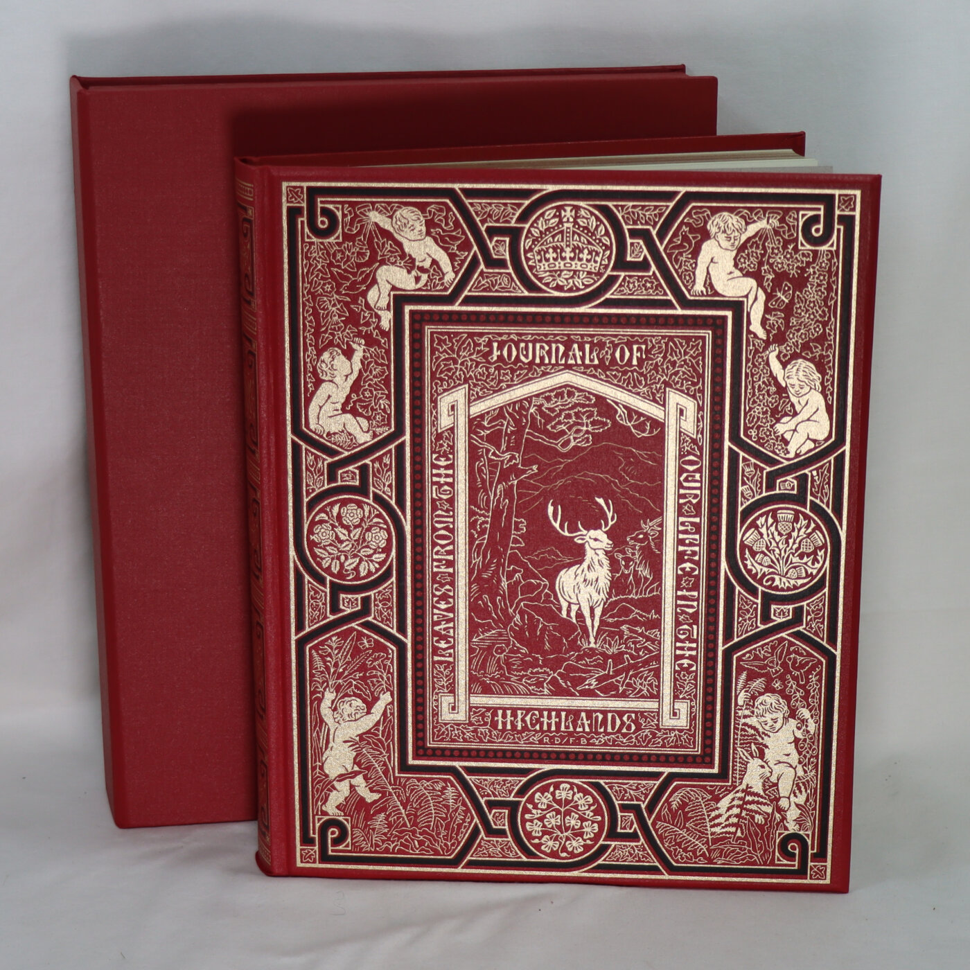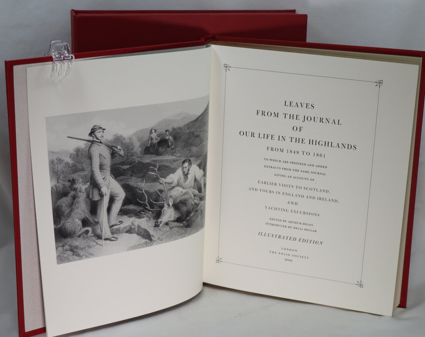 A fine folio limited edition. ‘From 1848 to 1861 by Queen Victoria’.This issue is based on the illustrated edition of 1868 with additional illustrations in colour and monochrome. Limited edition of 1850 numbered copies plus 50 lettered copies. Bound in full red buckram with an adapted facsimile of the original binding design in black and colour. Colour plates reproduce paintings from the royal collections, plus illustrations in monochrome and wood-engraved vignettes. Housed in a red clamshell box with a ‘VR’ motif in gold.