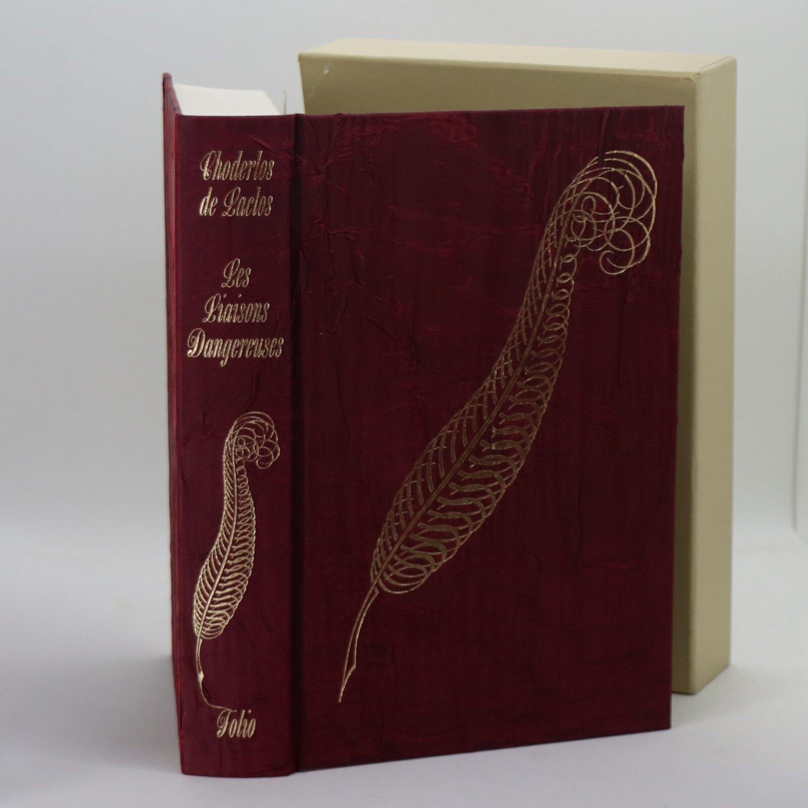In a fitted box. Dark red crushed silk binding with a gilt quill on the front board. Gilt title and quill on the spine.