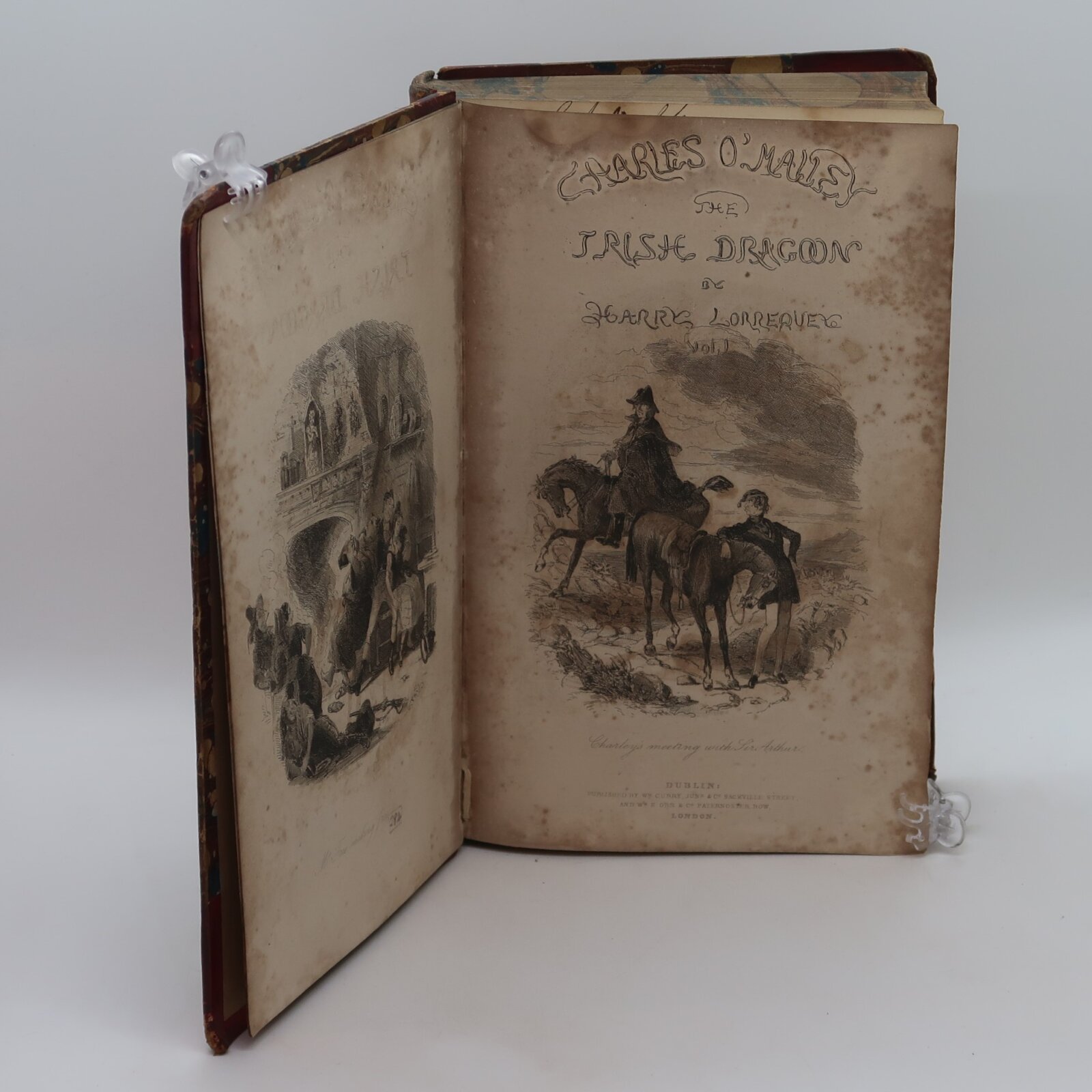 Faded red leather spine with green title plate and gilt title on the spine. Red and blue marbled boards. Dimensions are for one volume.