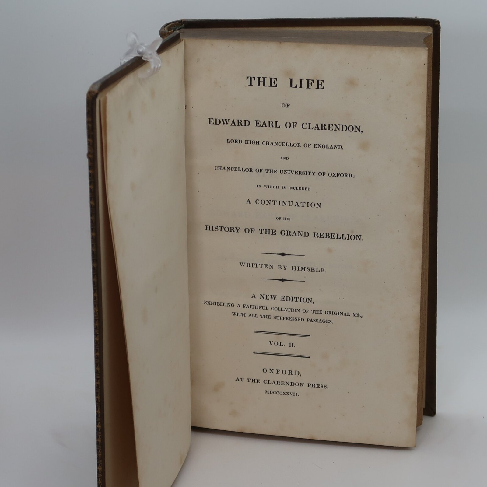 Brown leather binding with tan title plates, gilt banding with gilt lettering on the spine.