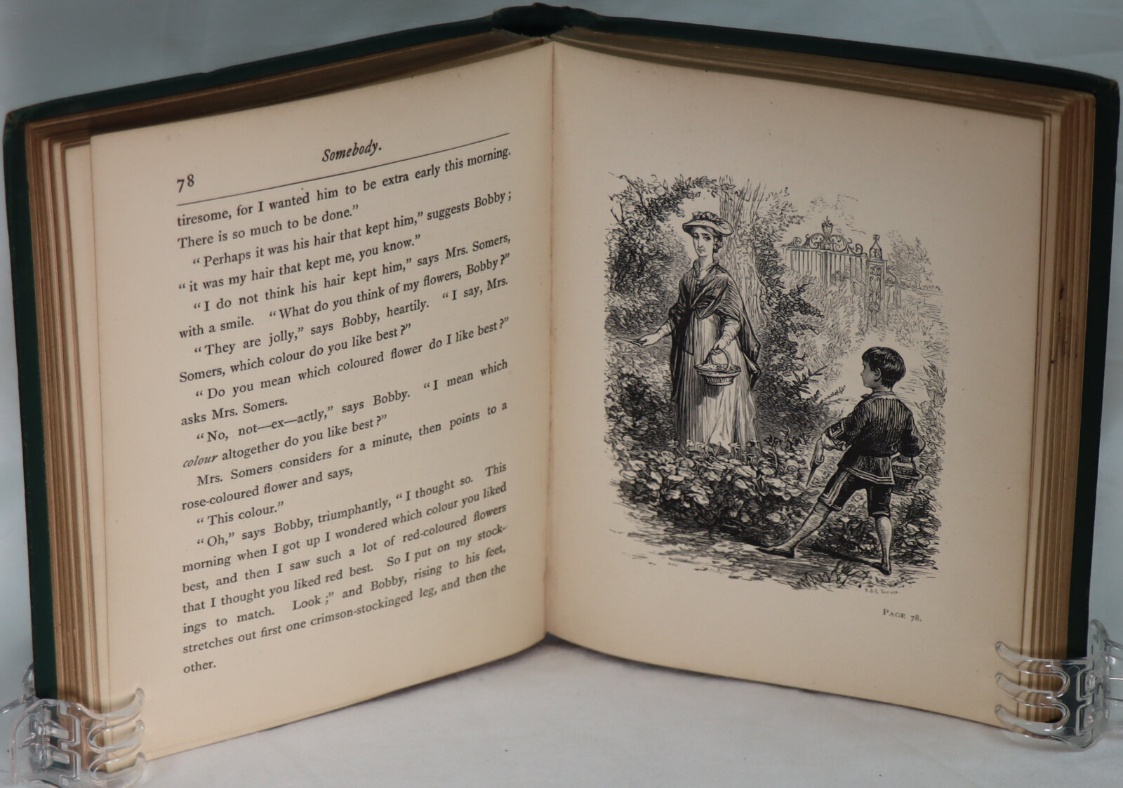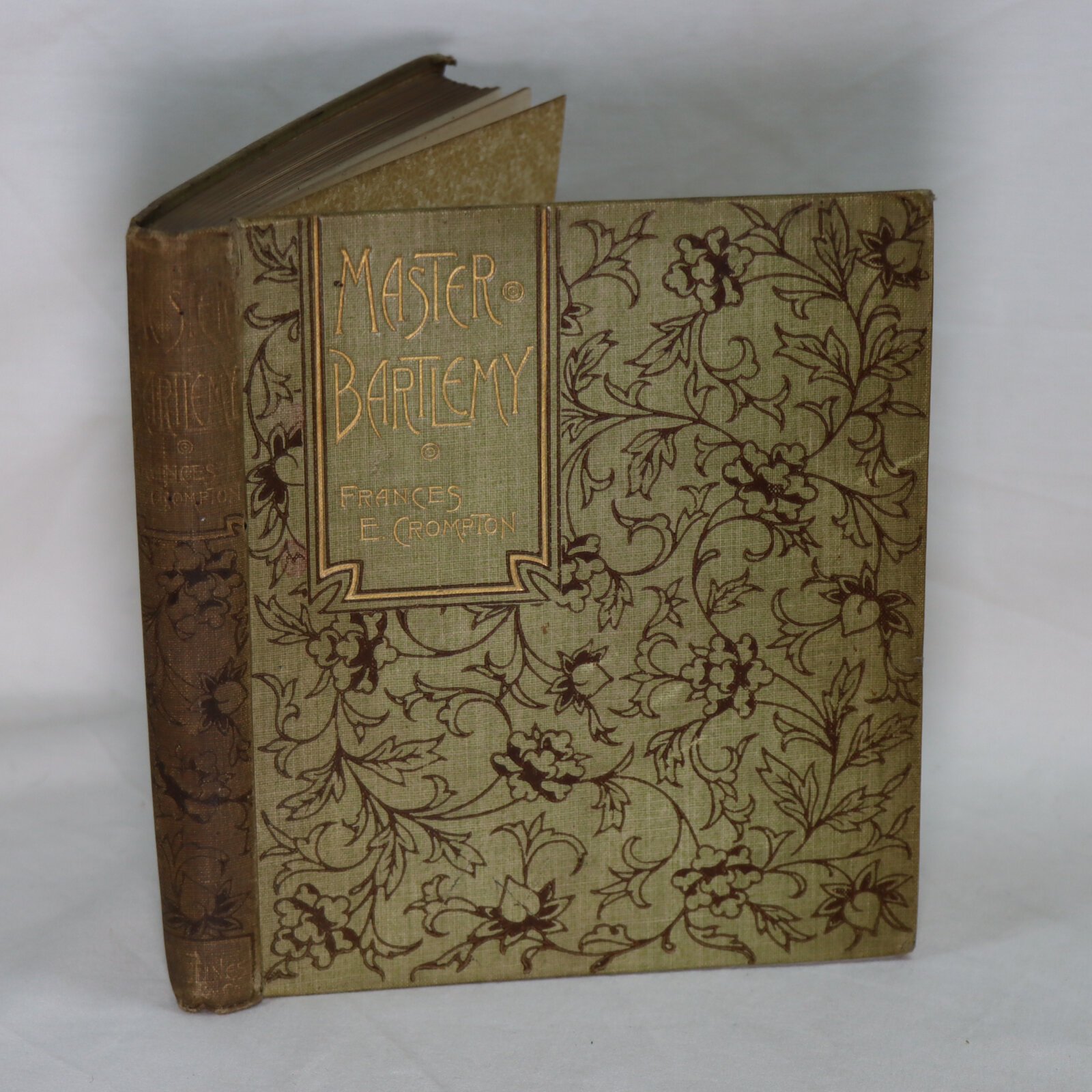 Light green floral pattern cloth binding with gilt title on the spine and on the front board.