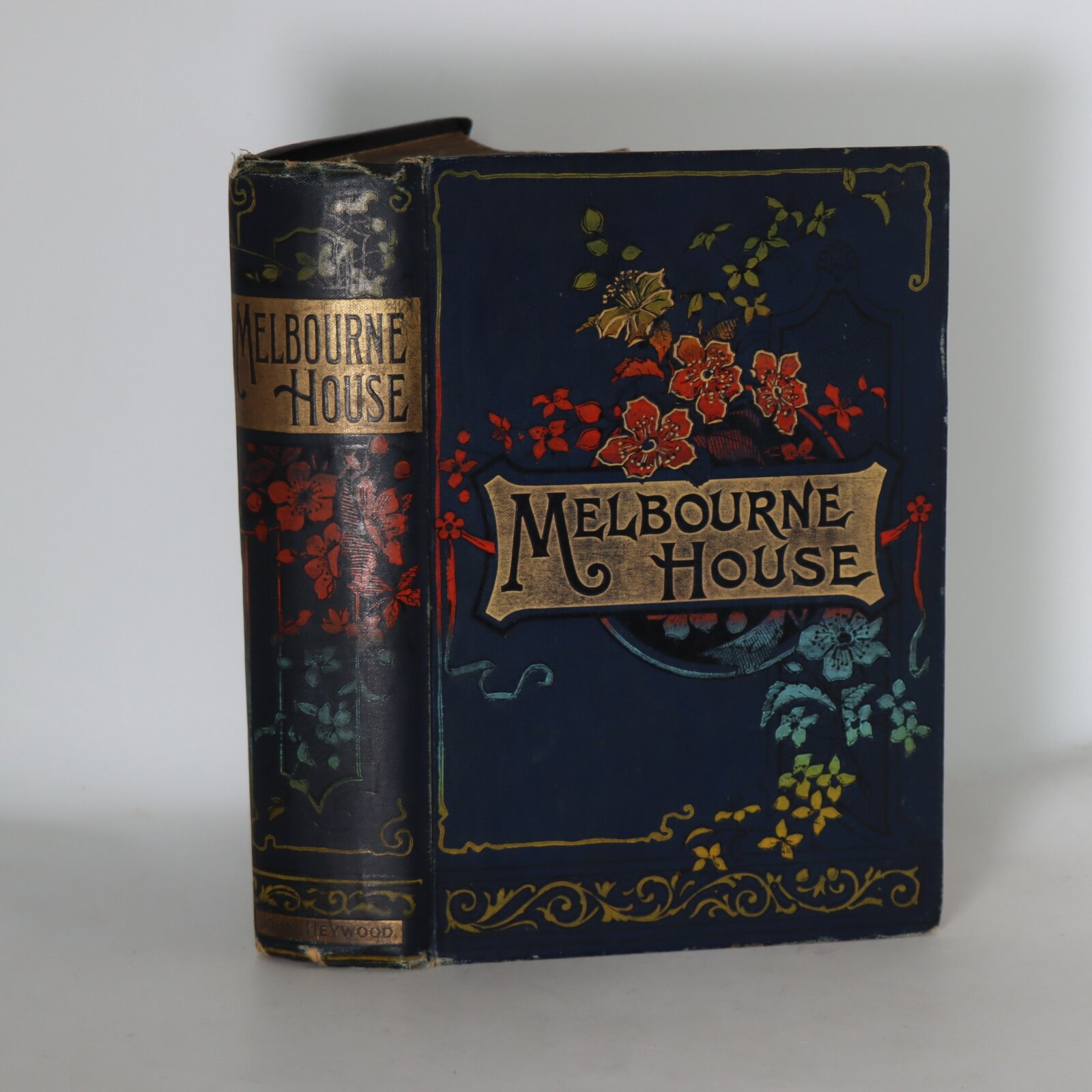 Navy cloth binding with gilt title and red and blue flowers on the spine and front board.