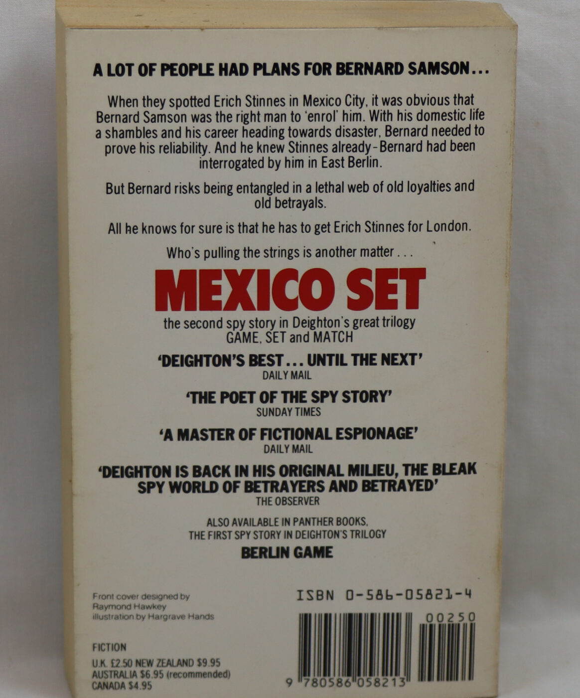 Mexico Set is a 1984 spy novel by Len Deighton. It is the second novel in the first of three trilogies about Bernard Samson, a middle-aged and somewhat jaded intelligence officer working for the British Secret Intelligence Service (MI6). Mexico Set is part of the Game, Set and Match trilogy, being preceded by the Berlin Game and followed by the London Match. This trilogy is followed by the Hook, Line and Sinker trilogy and the final Faith, Hope and Charity trilogy. Deighton’s novel Winter (1987) is a prequel to the nine novels, covering the years 1900-1945 and providing the backstory to some of the characters. Mexico Set continues the story that began with the Berlin Game, where Bernard Samson’s wife Fiona was unmasked as a KGB double agent.