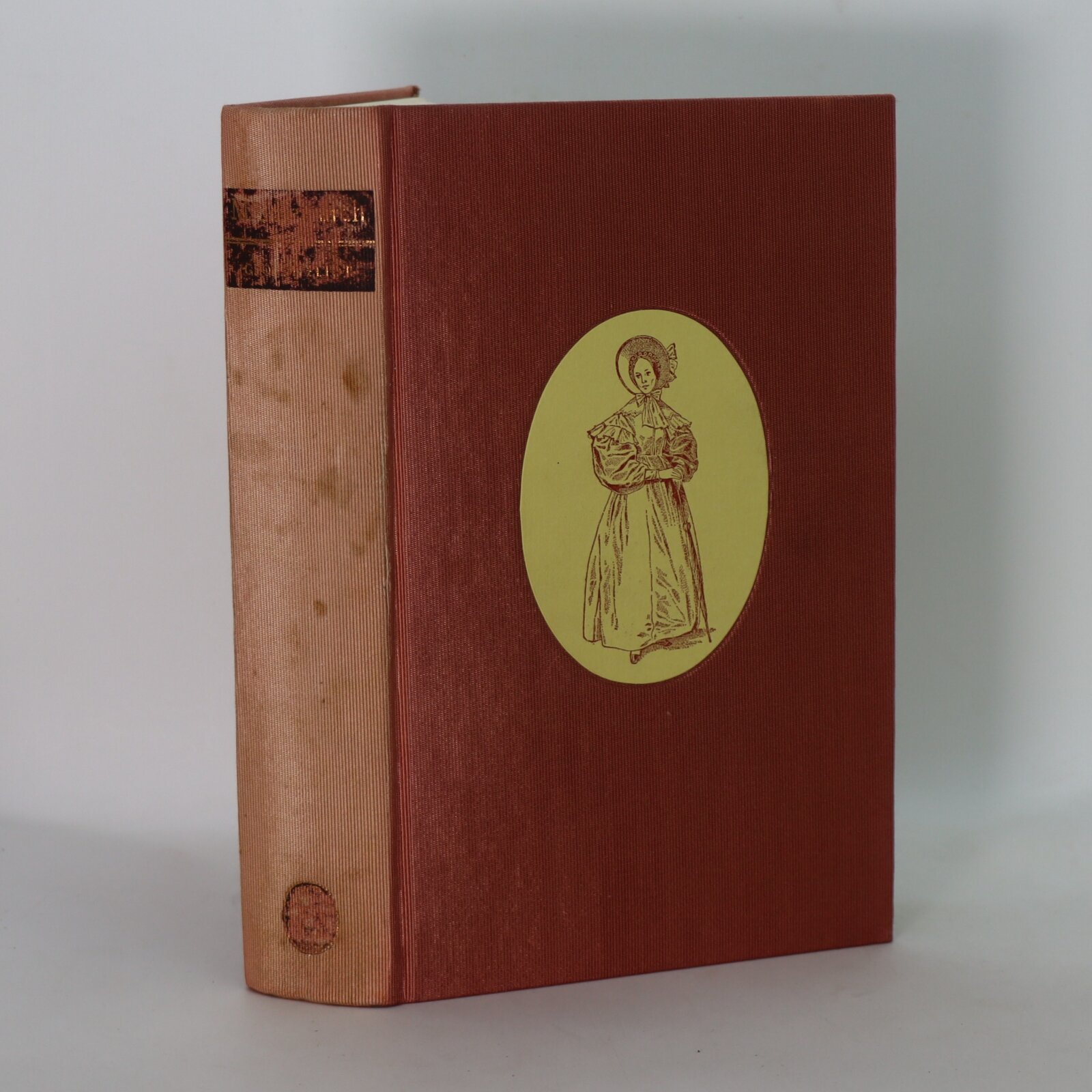 Pink cloth binding with gilt title on the spine and oval lady image on the front board.