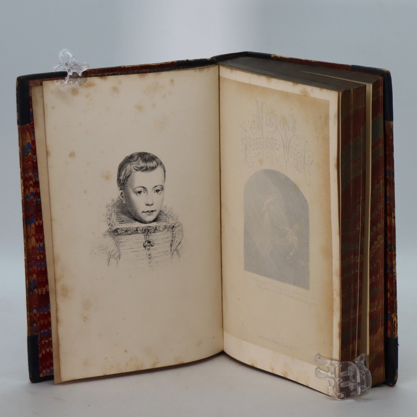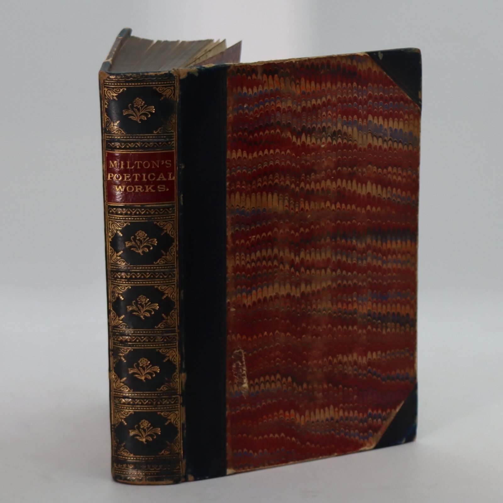 Navy calf spine with red title plate, gilt banding, decoration and lettering. Red and blue marbled boards.