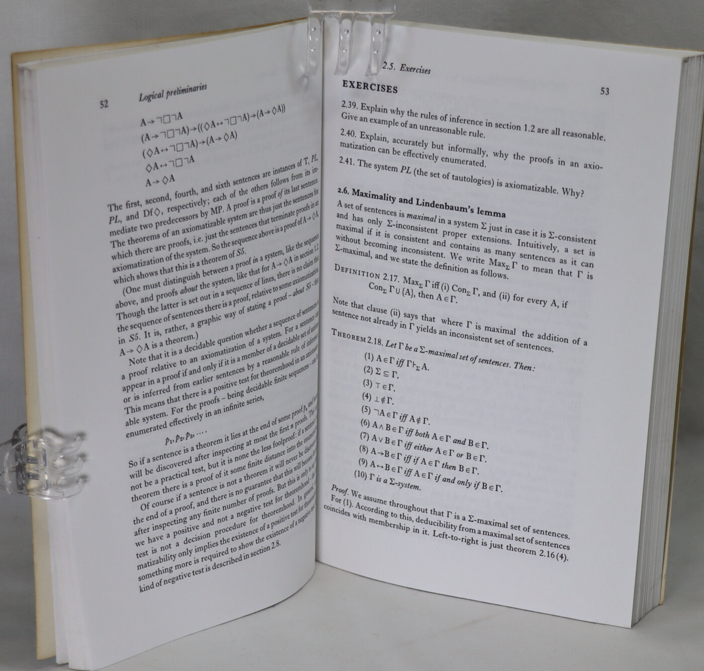 There is a lot of good stuff that is relegated to sections on exercises–e.g., p-morphisms, a safe extensions theorem, modal algebras, translations and correspondences between modal formulas and their models and first-order ones and their models (known other places as “correspondence/definability theory”). While there is a good number of exercises, most of them I encountered were quite easy and repetitive. Because of this, I found the text better suited to philosophy undergraduates (or novice graduates) than computer science or mathematics students. But at the same time there is little philosophical digression. The most redeeming feature of the book, I thought, was the latter section on neighborhood models and weak modal logics. I was also surprised to find the little “correspondence theory” that there was in the book. However, a better variation of exercises (in terms of both difficulty and method of proof/construction) would be greatly welcome.