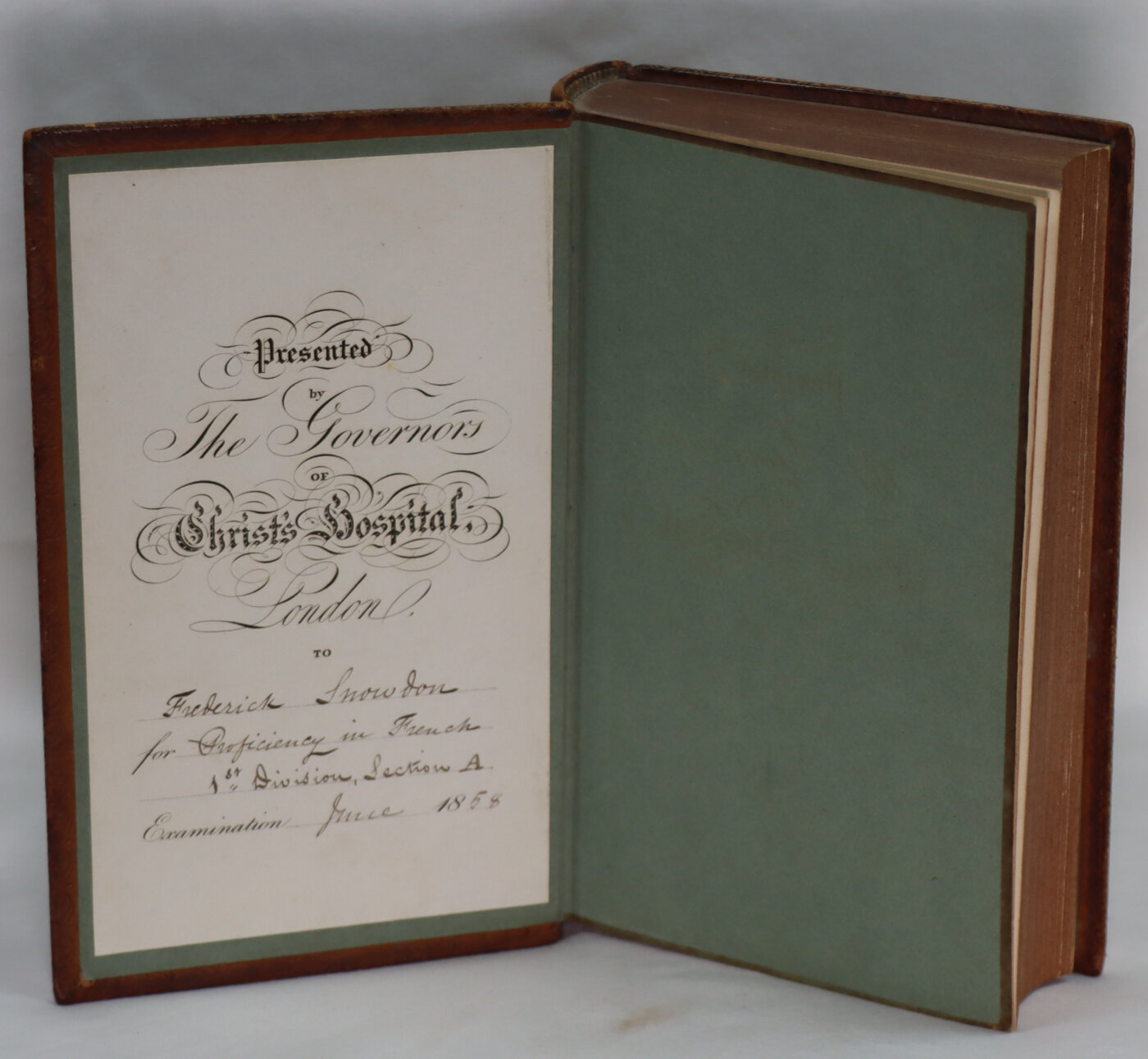 Tan calf binding with green title plate, gilt decoration, banding and title on the spine.
