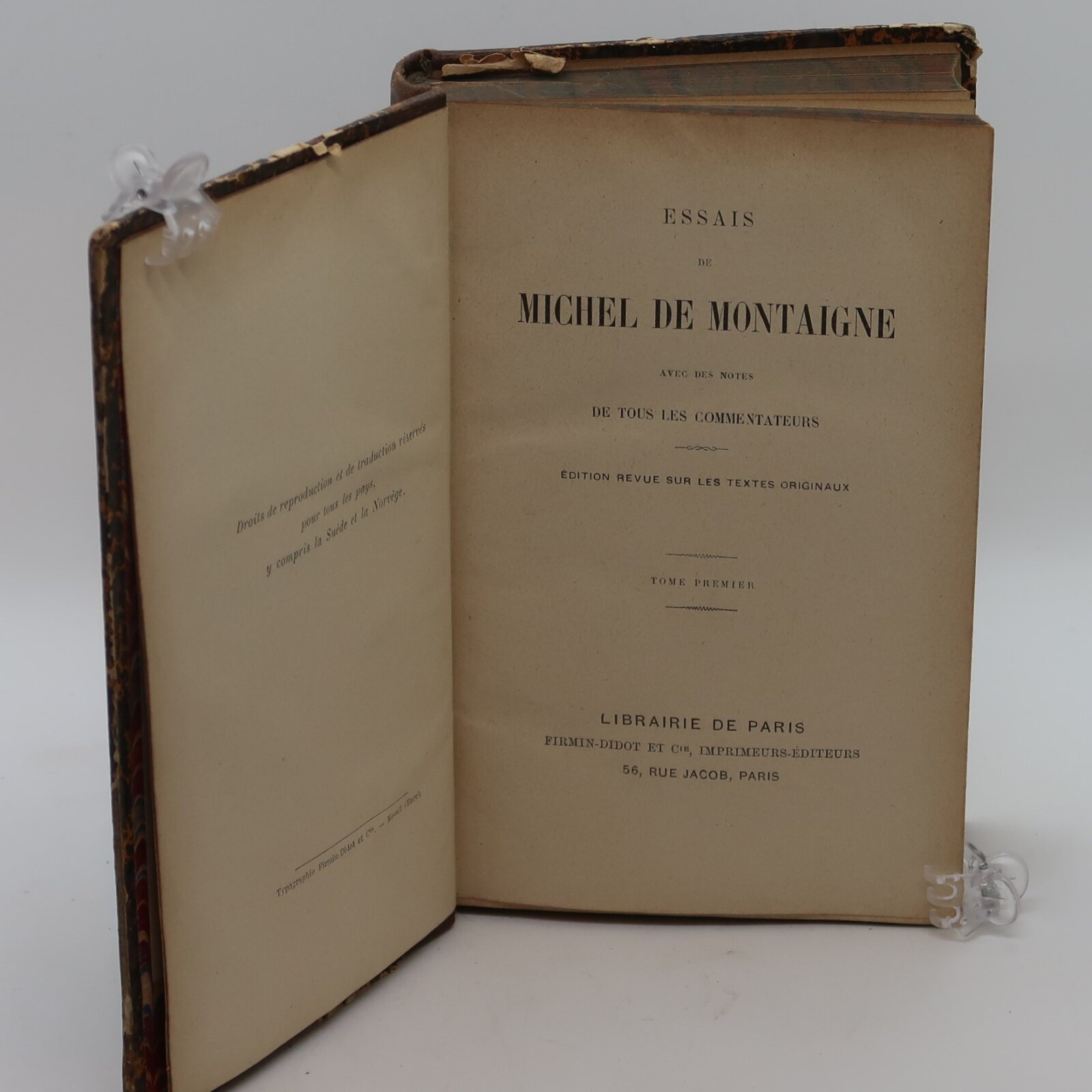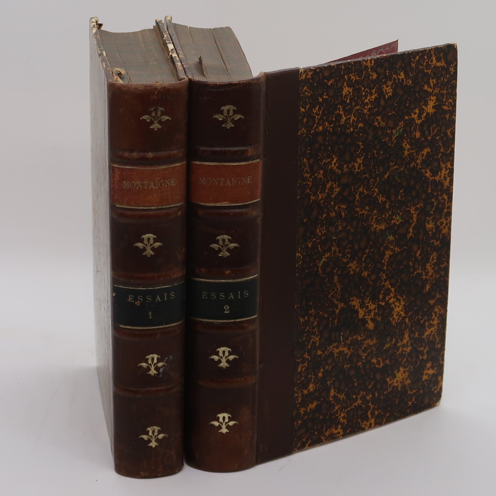 Brown leather spine with raised banding, black and tan title plates, gilt lettering and decoration on the spine. Yellow and brown mottled boards. Two volumes.
