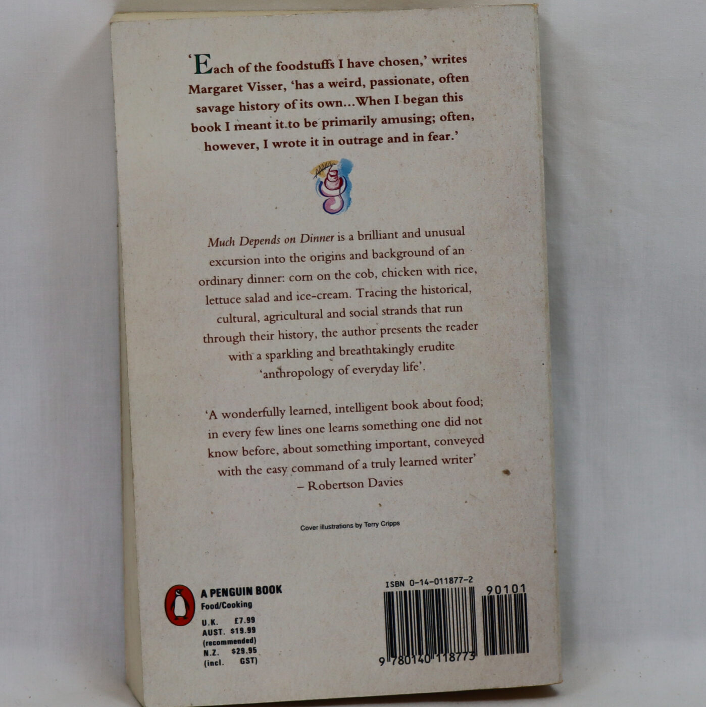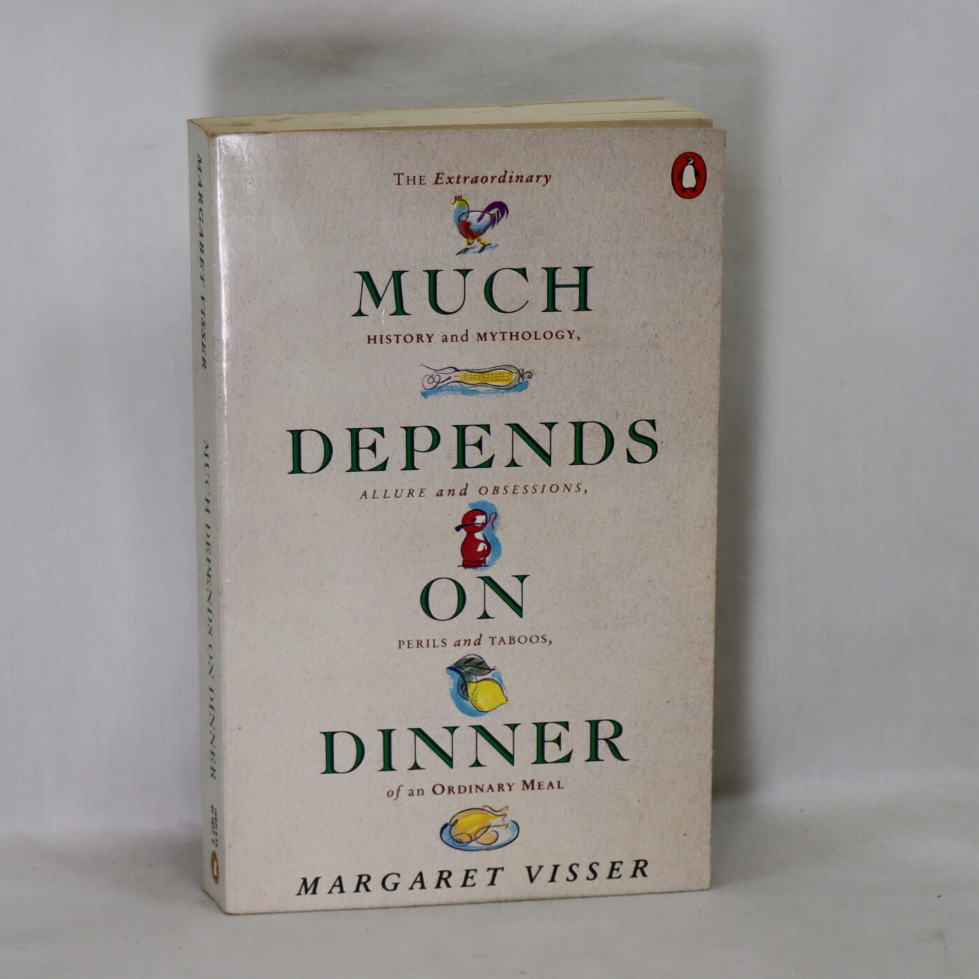 For conditions, please view photographs. A nice clean copy from the library gathered by the famous Cambridge Don, computer scientist, food and wine connoisseur, Jack Arnold LANG. Winning unanimous praise on its publication and now available in paperback from Grove Press, Much Depends on Dinner is a delightful and intelligent history of the food we eat. Presented as a meal, each chapter represents a different course or garnish. Borrowing from Byron’s classic poem “Don Juan” for her title (“Since Eve ate apples, much depends on dinner”), writer Margaret Visser looks to the most ordinary American dinner for her subject – corn on the cob with butter and salt, roast chicken with rice, salad dressed in lemon juice and olive oil, and ice cream – submerging herself in the story behind each food. In this indulgent and perceptive guide we hear the history of Corn Flakes, why canned California olives are so unsatisfactory (they’re picked green, chemically blackened, then sterilized), and the fact that in Africa, citrus fruit is eaten rind and all. For food lovers of all kinds, this unexpectedly funny and serious book is a treasure of information, shedding light on one of our most favorite pastimes.