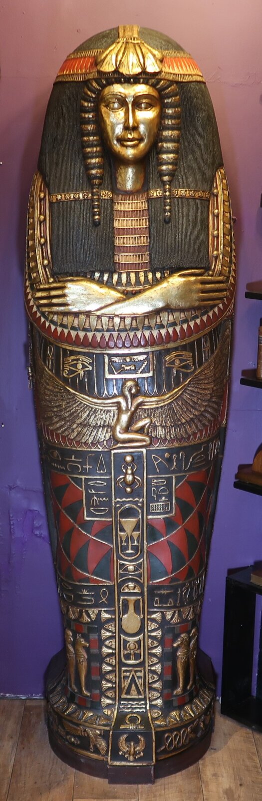 History: One of the most important objects purchased, whether for royalty or other elites, for a tomb was the coffin. It's purpose from the earliest times was the protection of the body, preserving it from deterioration or mutilation. During Predynastic times, the Egyptians shrouded corpses in mats or furs and enclosed them in pots, baskets or clay coffins. In some areas a wooden scaffold was constructed around the body, and this might be considered the precursor to actual coffins.