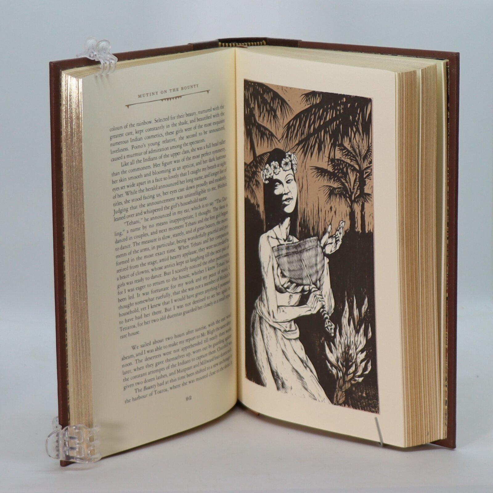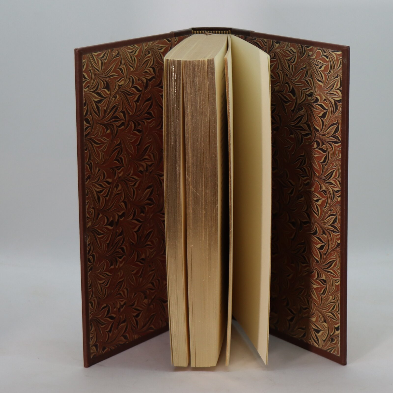 Brown leatherette spine with gilt title and decoration. Brown boards with gilt ship design. All edges gilt.