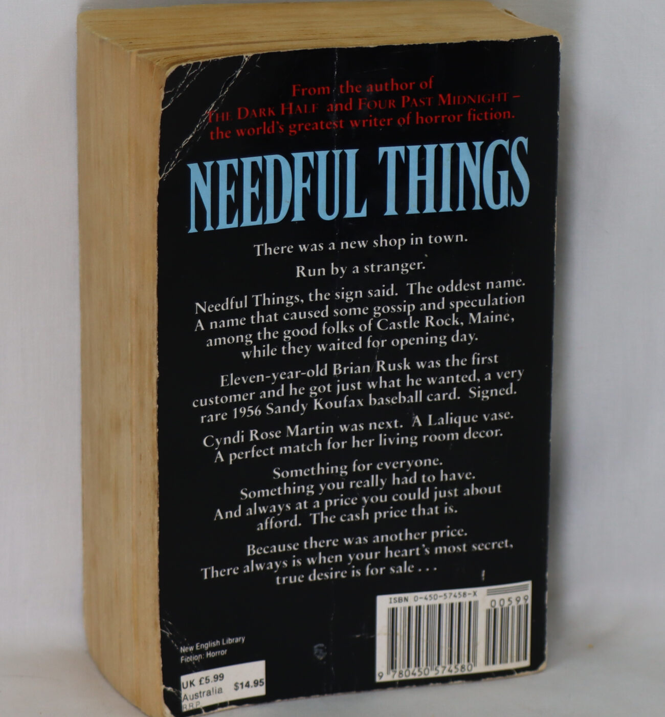 The town of Castle Rock, Maine has seen its fair share of oddities over the years, but nothing is as peculiar as the little curio shop that’s just opened for business. Its mysterious proprietor, Leland Gaunt, seems to have something for everyone out on display at Needful Things…interesting items that run the gamut from worthless to priceless. Nothing has a price tag in this place, but everything is certainly for sale. The heart’s desire for any resident of Castle Rock can easily be found among the curiosities…in exchange for a little money and—at the specific request of Leland Gaunt—a whole lot of menace against their fellow neighbors. Everyone in town seems willing to make a deal at Needful Things, but the devil is in the details. And no one takes heed of the little sign hanging on the wall: Caveat emptor. In other words, let the buyer beware…