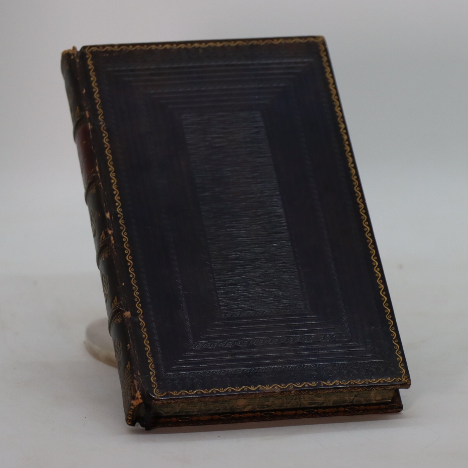 Full navy calf binding. Unusual squared pattern on both boards with gilt edging. Red title plate with gilt floral pattern and lettering on the spine. Green marbled end papers and edges.