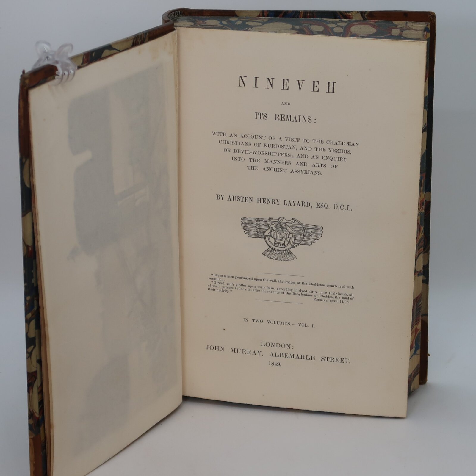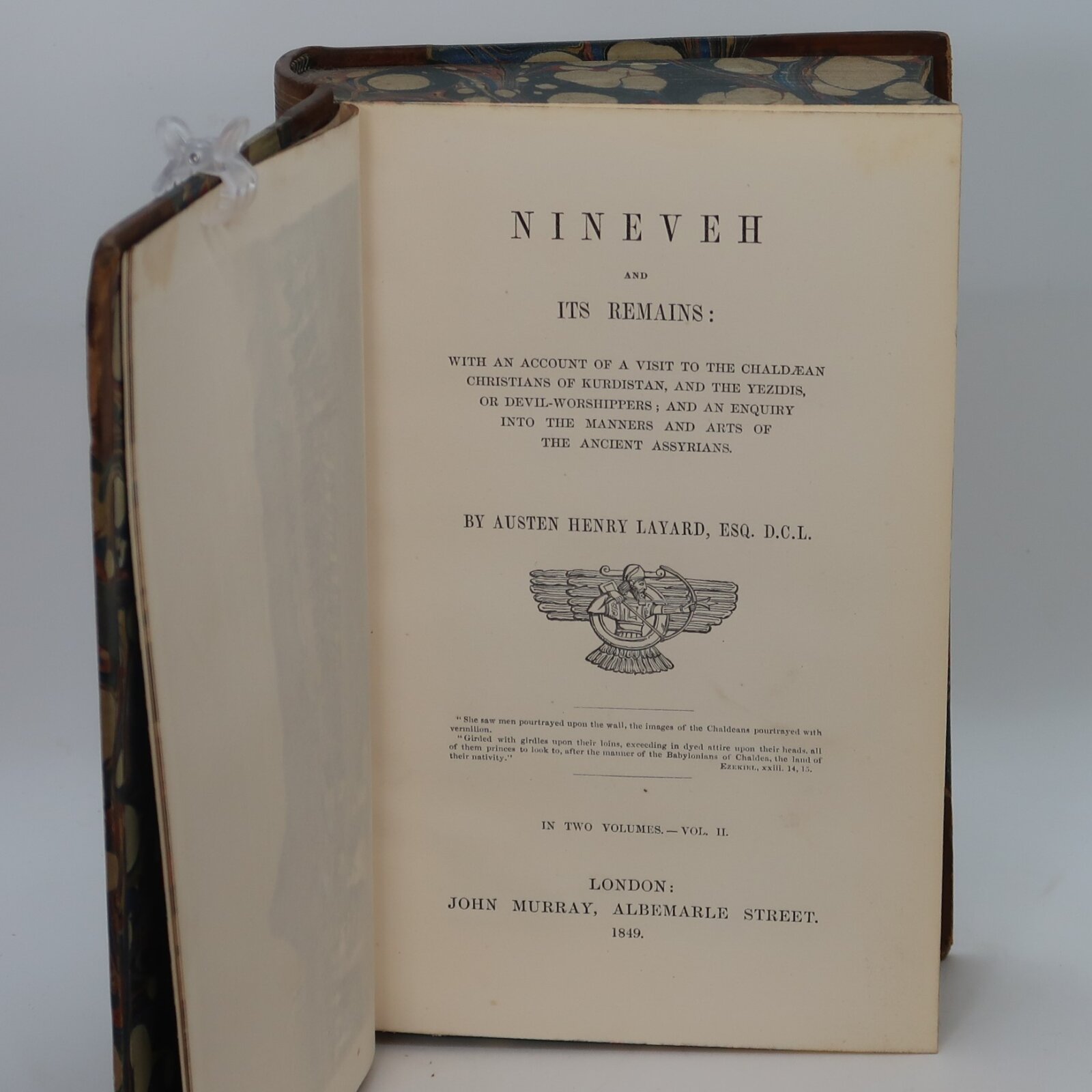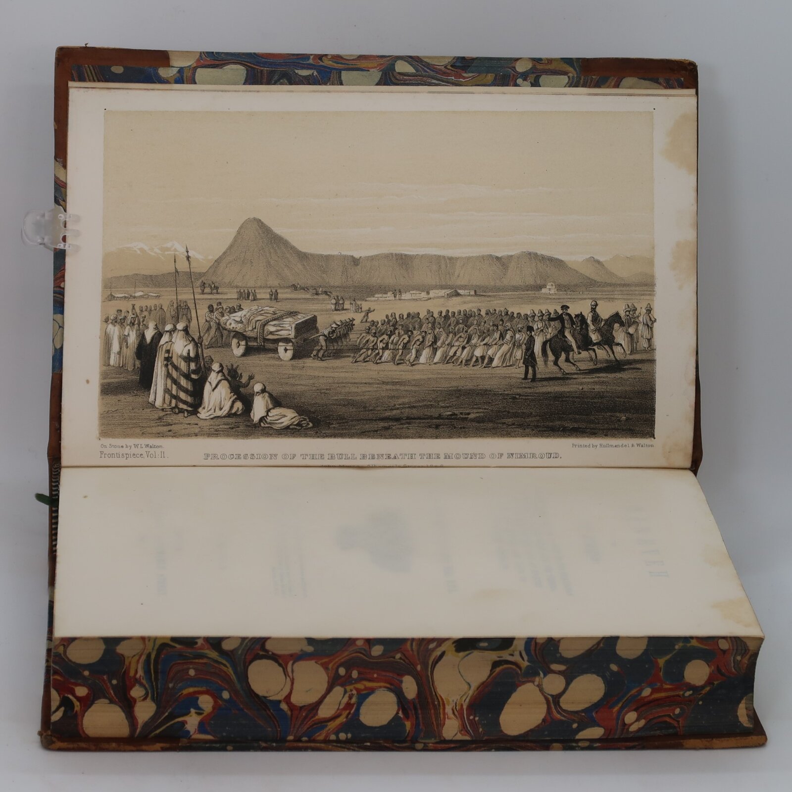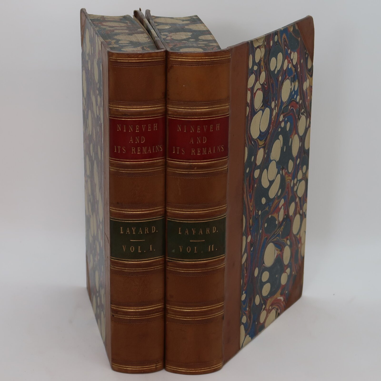 Tan leather spine with red and green title plates, gilt banding and lettering on the spine. Blue marbled boards.