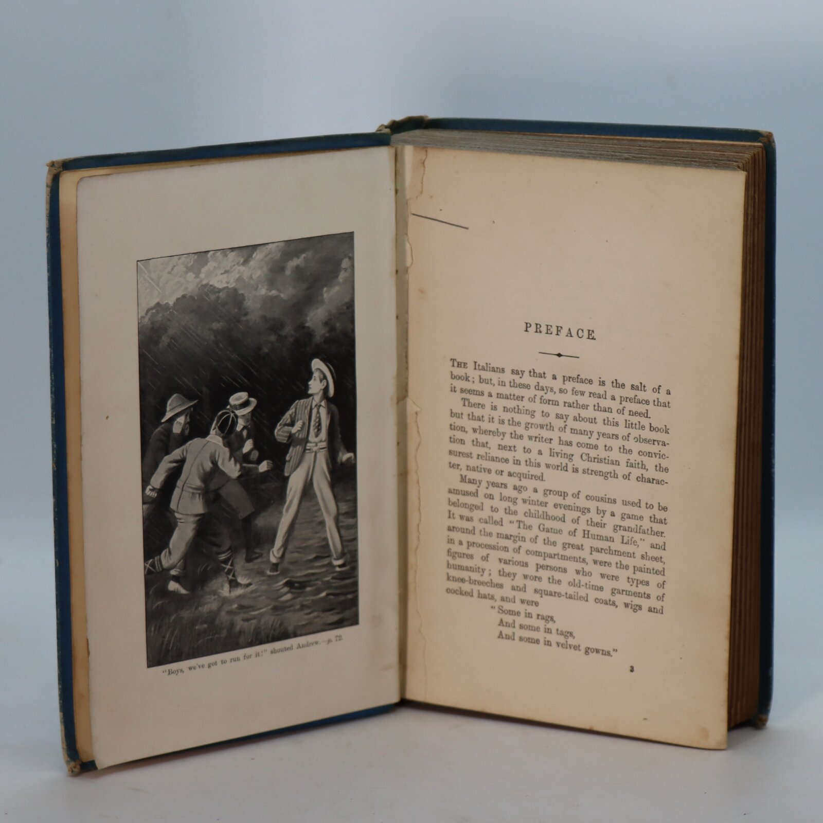 Blue cloth binding with four boys image and title on the front board. Gilt title plate on a faded to green spine.
