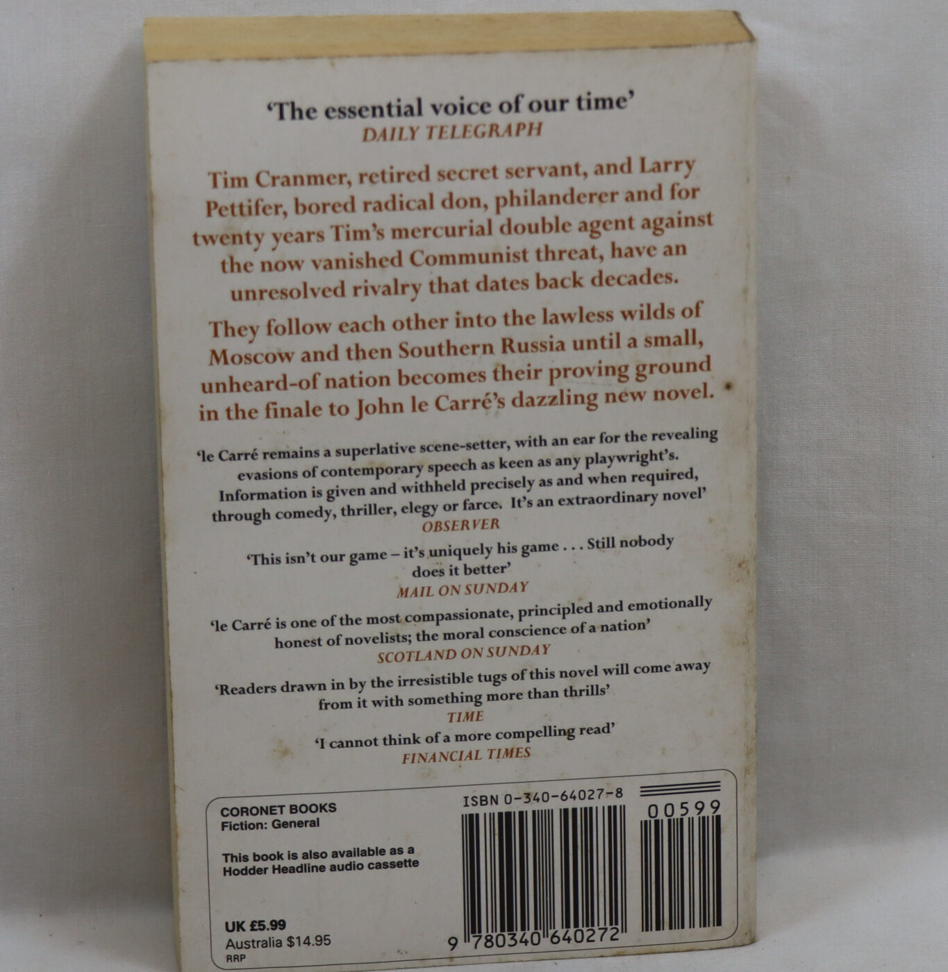 Le Carré’s post-Cold War masterpiece, filled with suspense, betrayal, desire and drama. The Cold War is over and retired secret servant Tim Cranmer has been put out to pasture, spending his days making wine on his Somerset estate. But then he discovers that his former double agent Larry - dreamer, dissolute, philanderer and disloyal friend – has vanished, along with Tim’s mistress. As their trail takes him to the lawless wilds of Russia and the North Caucasus, he is forced to question everything he stood for. Set in a fragmented, uncertain post-Soviet world, le Carré’s brutal story of falsehoods and betrayal shows men playing dangerous games beyond their control.