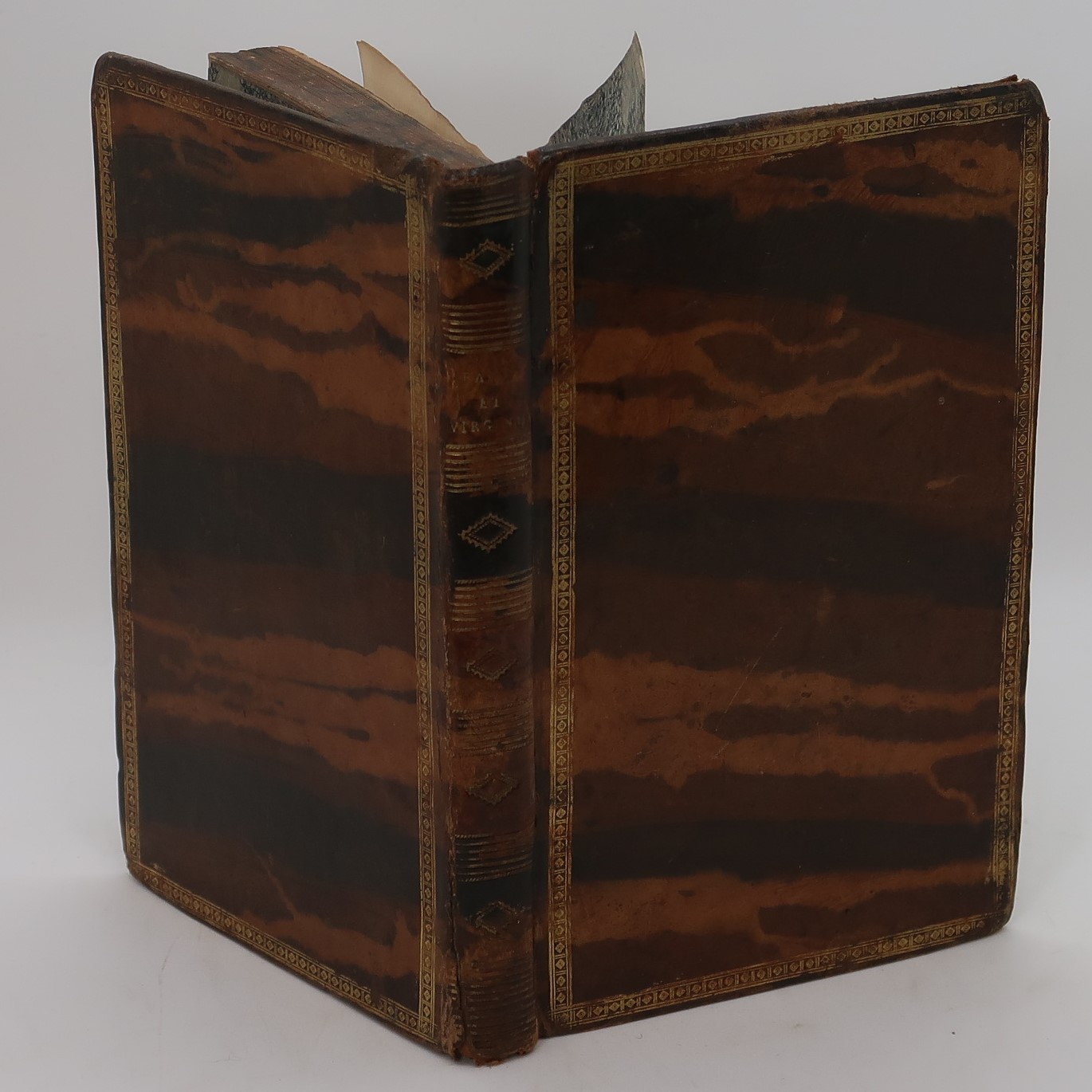 French style brown and black leather full binding with gilt banding and title on the spine. Gilt ribbon edging on both boards.