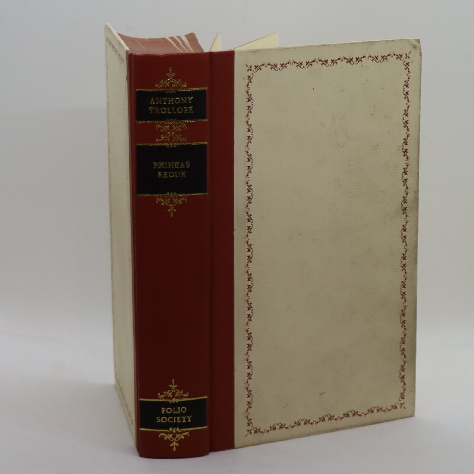 Tan cloth binding with black title plates with gilt lettering on the spine. Cream boards with tan floral edging.