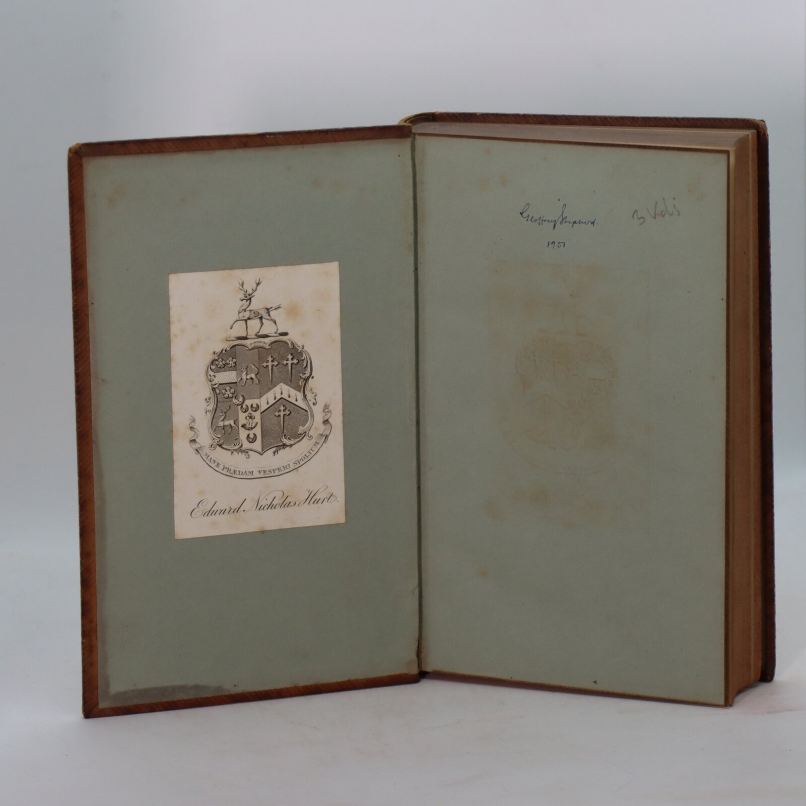 Full tan calf. Red and green title plates with gilt lettering and floral decoration on the spine.