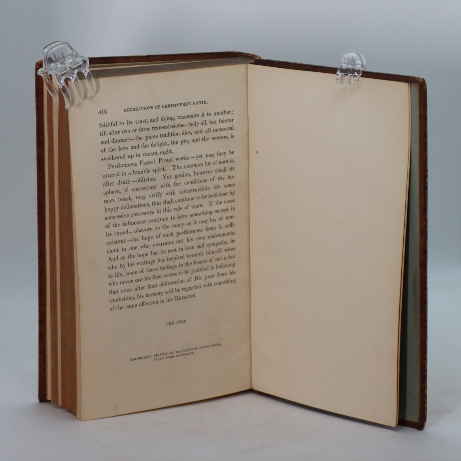 In 1822 began the series of Noctes Ambrosianae, after 1825 mostly Wilson’s work. These are discussions in the form of convivial table-talk, including wonderfully various digressions of criticism, description and miscellaneous writing. There was much ephemeral, a certain amount purely local, and something occasionally trivial in them. But their dramatic force, their incessant flashes of happy thought and happy expression, their almost incomparable fulness of life, and their magnificent humour give them all but the highest place among genial and recreative literature. “The Ettrick Shepherd,” an idealised portrait of James Hogg, one of the talkers, is a most delightful creation. Before this, Wilson had contributed to Blackwood’s prose tales and sketches, and novels, some of which were afterwards published separately in Lights and Shadows of Scottish Life (1822), The Trials of Margaret Lindsay (1823) and The Foresters (1825); later appeared essays on Edmund Spenser, Homer and all sorts of modern subjects and authors.