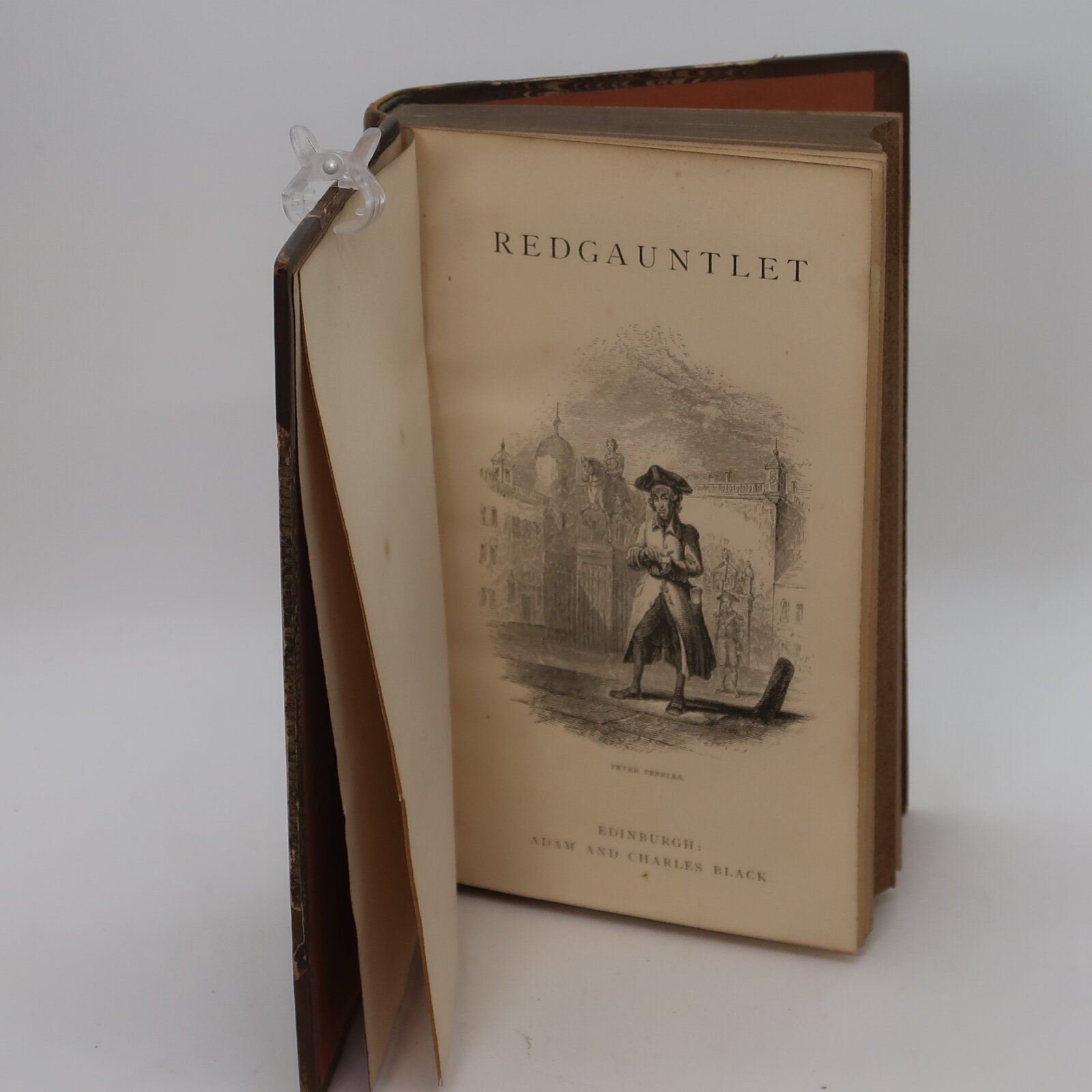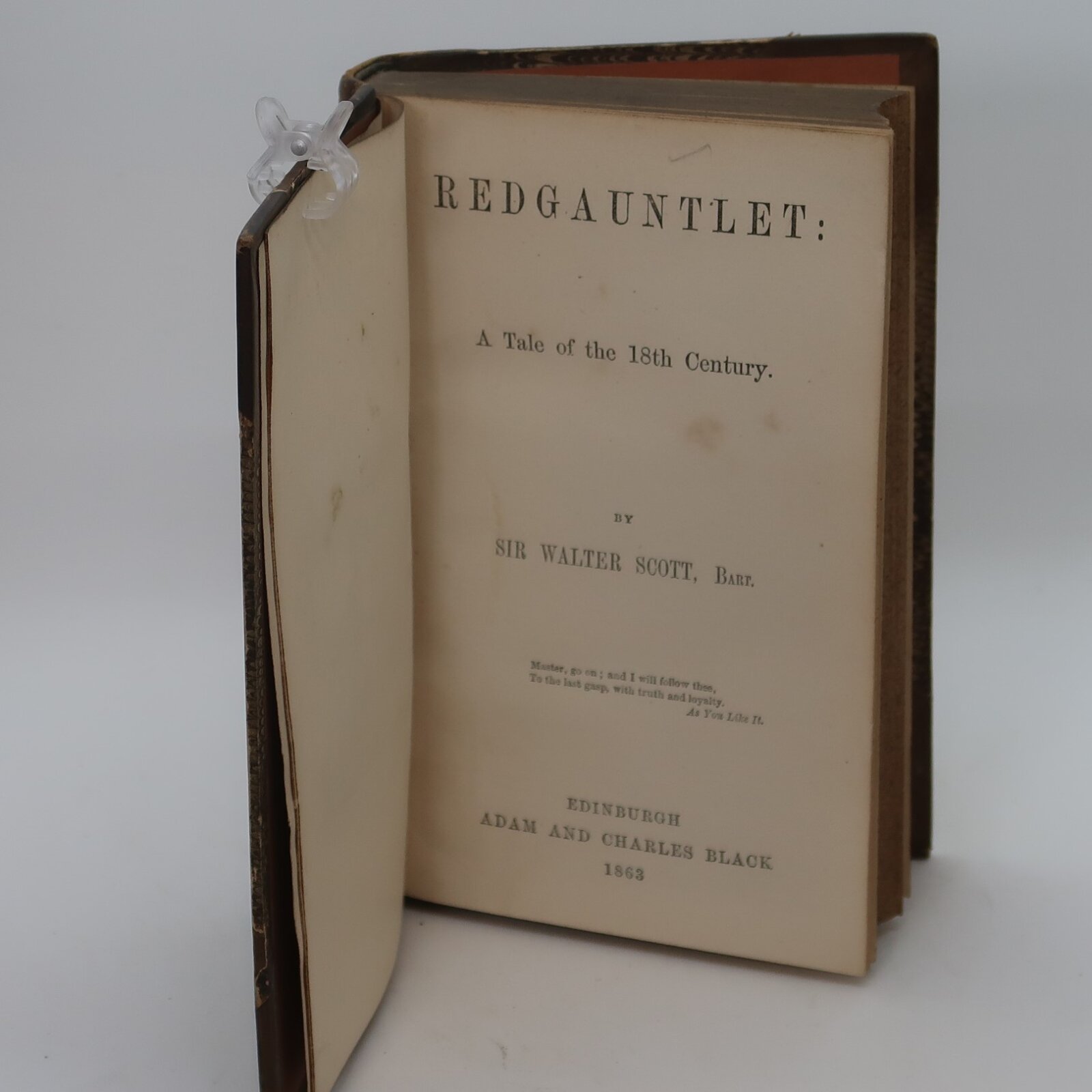 Tan Leather binding with green title plate, gilt banding and lettering on the spine. Brown marbled boards. part of a set.