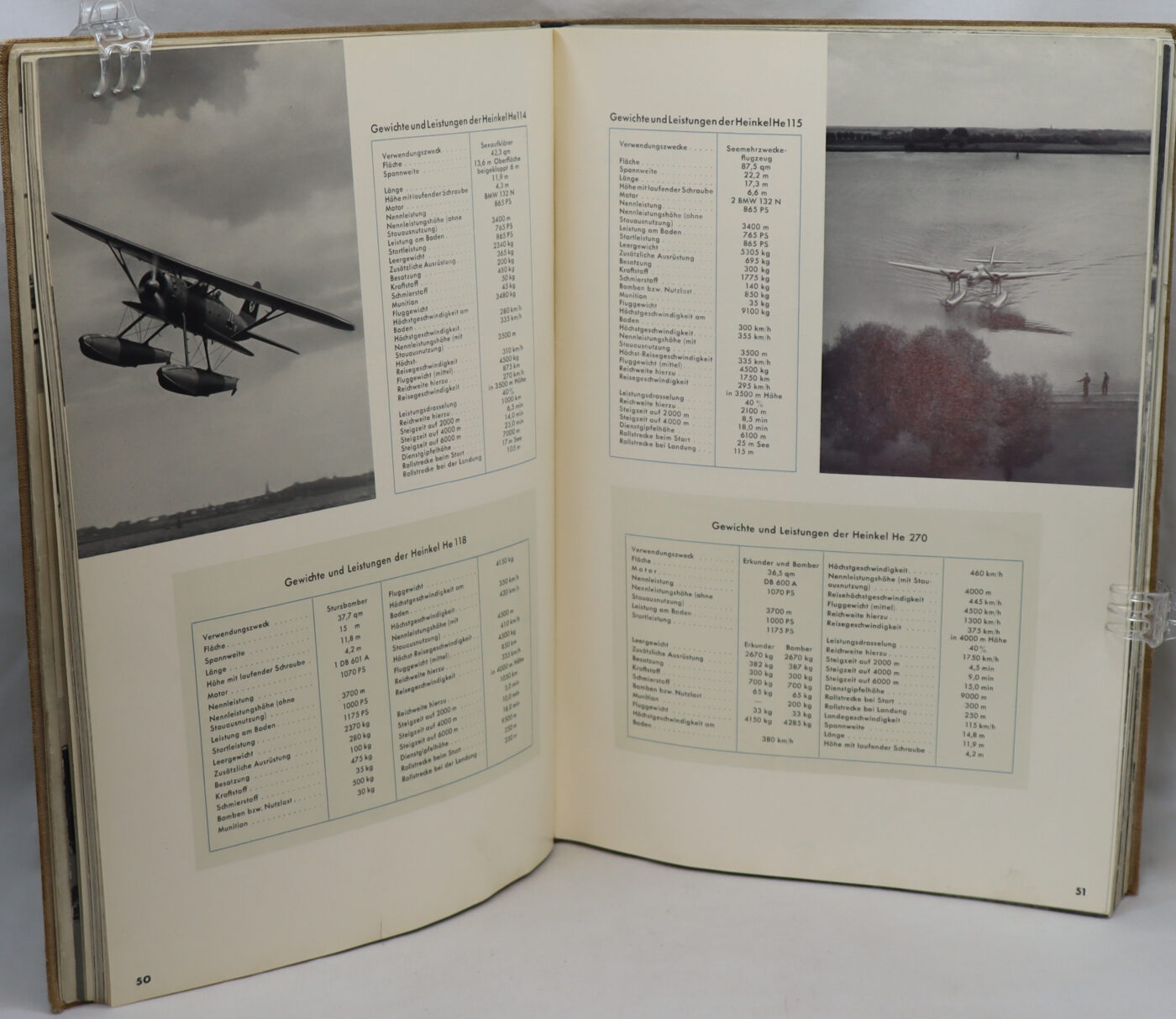 Please view our extensive photographs. Softcover. Condition: g- to vg. First edition. Folio (14 x 10″). 57pp., 1 folding plan at rear. Original wraps in gray and light blue with federation logo and gray lettering on cover. Blue Federation logo on half title. Photo-illustrated title page. The introduction stresses Yugoslavia as an ally while laying out the exhibition program of fighter planes, gliders, aviation research and production, including aviation accessories, of the German aviation industry on more than 3,000 square meters. The publication is profusely illustrated with b/w photographs of airplanes, airplane motors and accessories throughout. The folding plan at rear shows the exhibition layout for the German companies in halls two and three, printed in two colors. The participating German aircraft companies are Arado Flugzeugwerke GmbH, Babelsberg, Dornier-Werke GmbH, Friedrichshafen, the Focke, Achgelis & Co. GmbH, Delmenhorst, Ernst Heinkel Flugzeugwerke, Rostock, the Gothaer Waggonfabrik AG, Gotha, Henschel Flugzeugwerke AG, Schönefeld near Berlin, the Leichtflugzeugbau Klemm GmbH, Böblingen, the Siebel Flugzeugwerke, Halle, Junkers Flugzeug- und Motorenwerke AG, Dessau, and the Flugzeugbau Schweyer, Mannheim. The airplanes and motors depicted in this brochure with diagrams showing the technical specifications. Illustrated section with companies producing raw materials for the airplane production at rear. The flaps of the folding plan at rear with listing of all participating companies. Text in German – interior in very good condition.