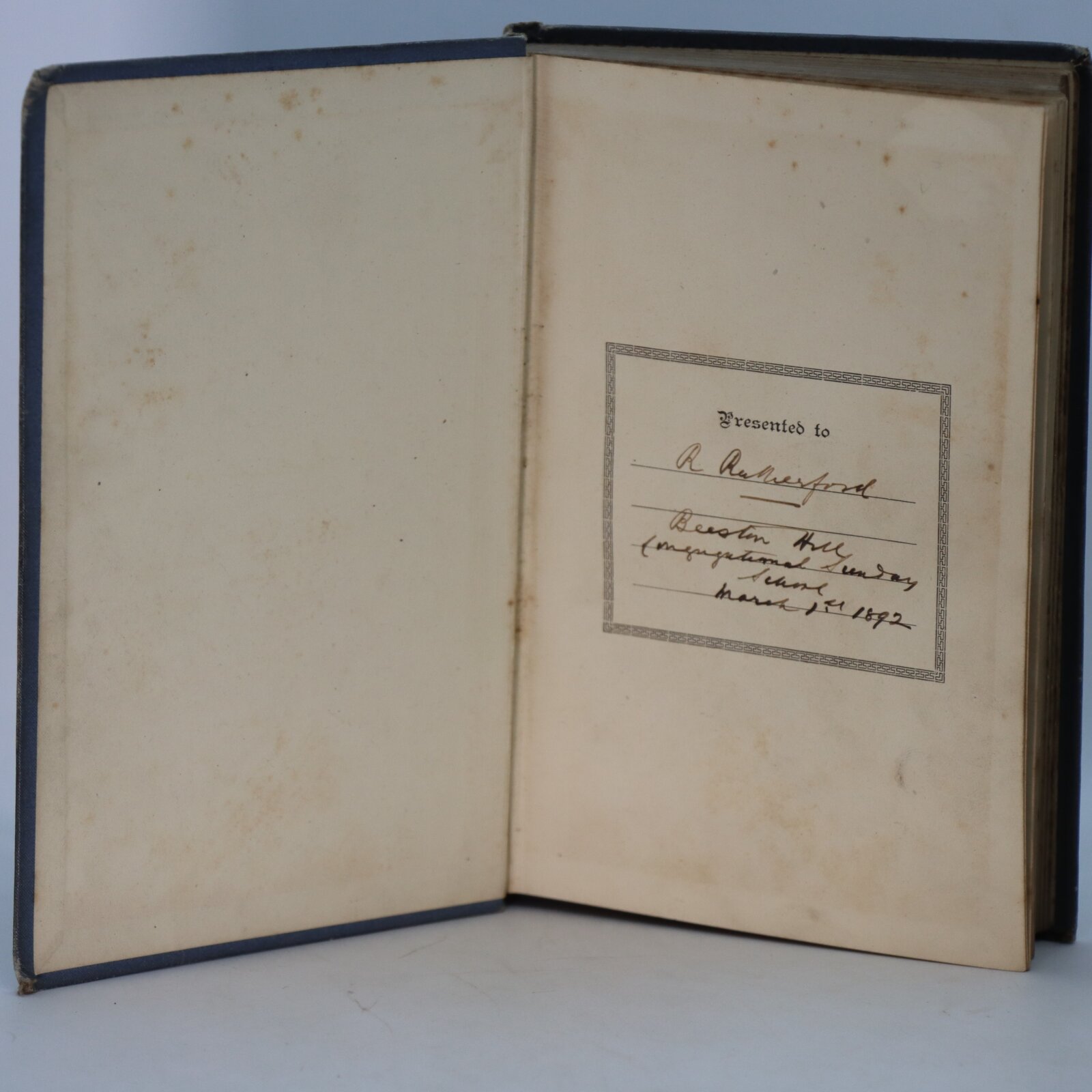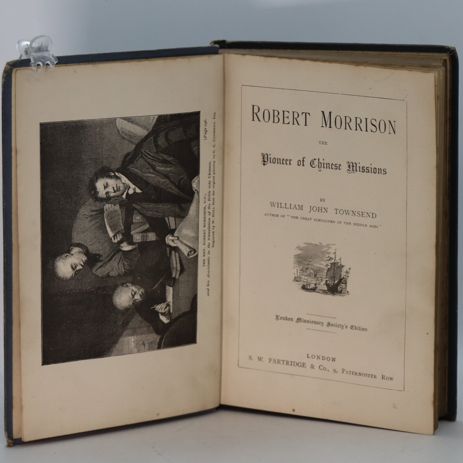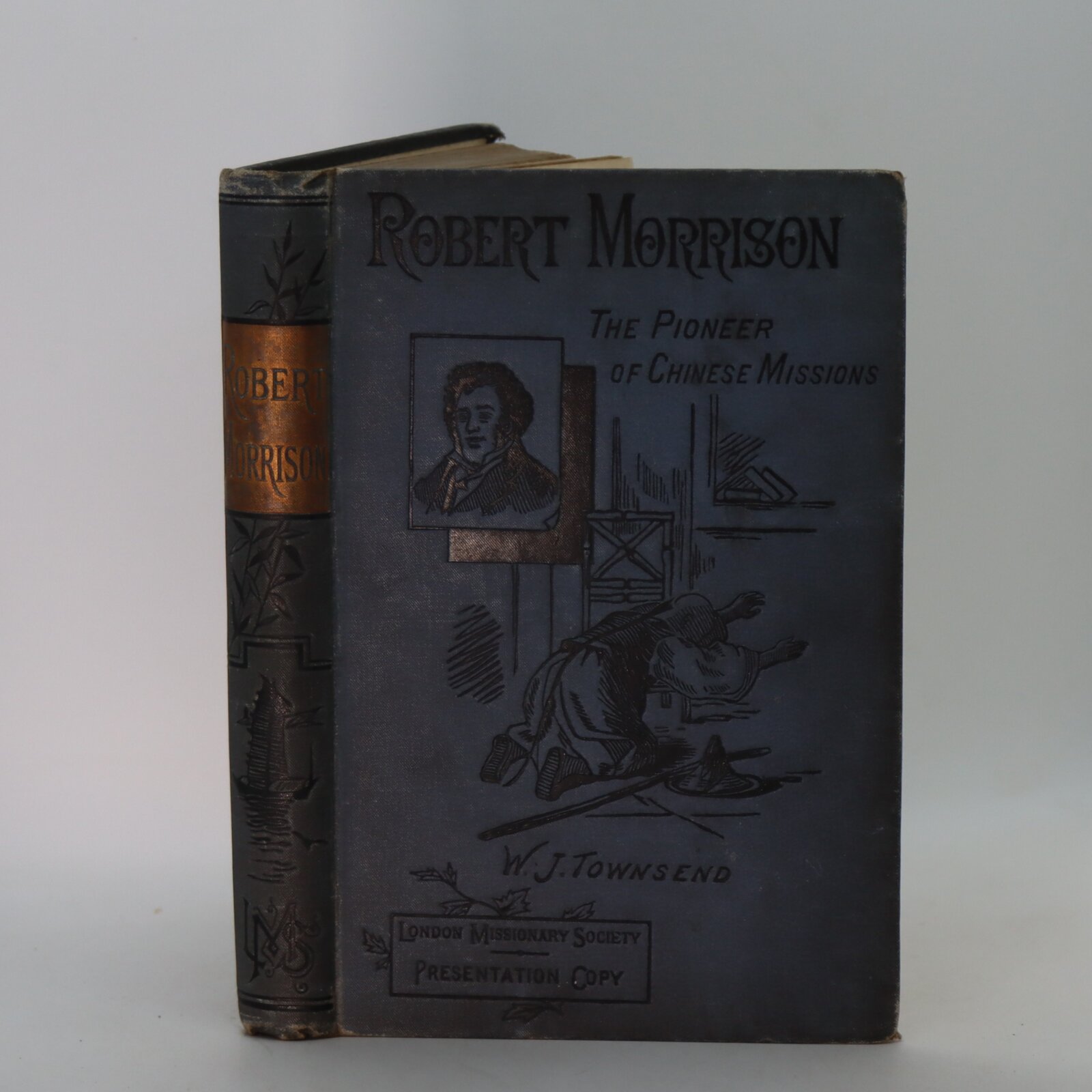 Blue cloth binding with gilt title on the spine. Black title and image of chinese figure and Robert Morrison on the front board.
