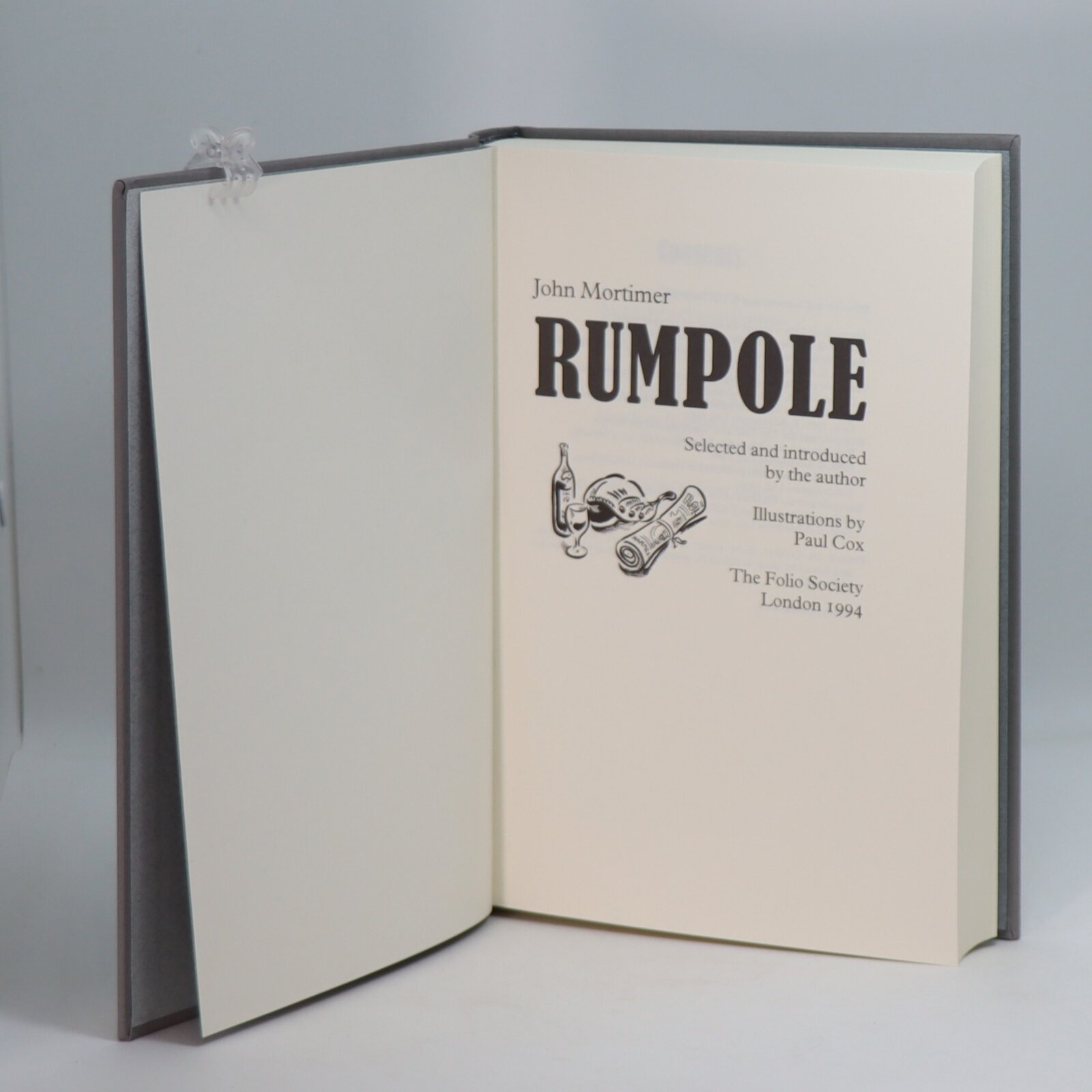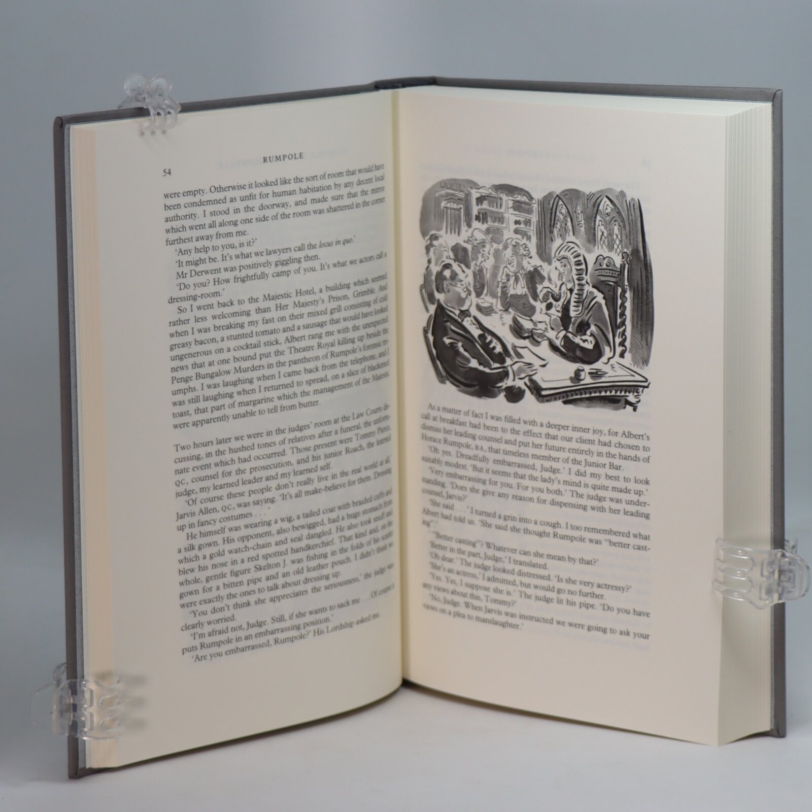 In a fitted box. Grey cloth with Rumpole image in silver and brown on front board. Red title plate with silver lettering on the spine.