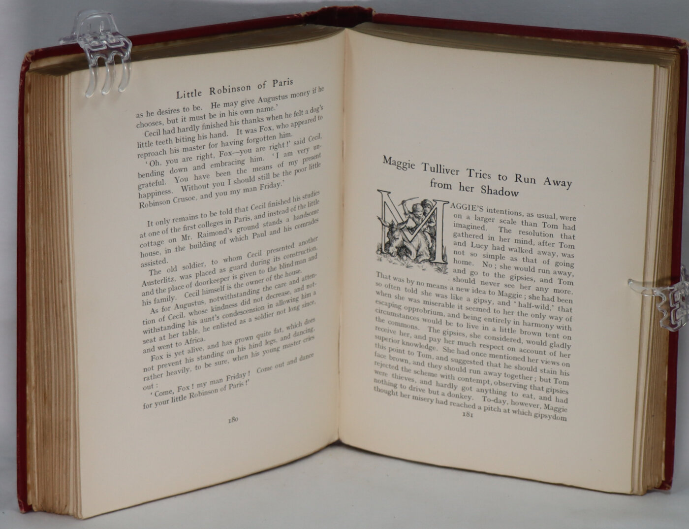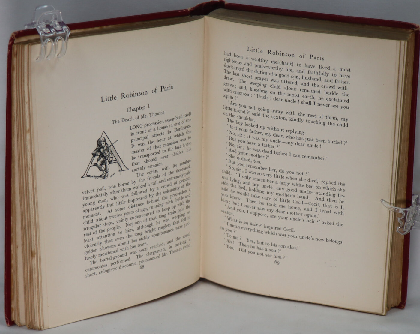 Red cloth binding with gilt title and boy decoration on the front board and spine.
