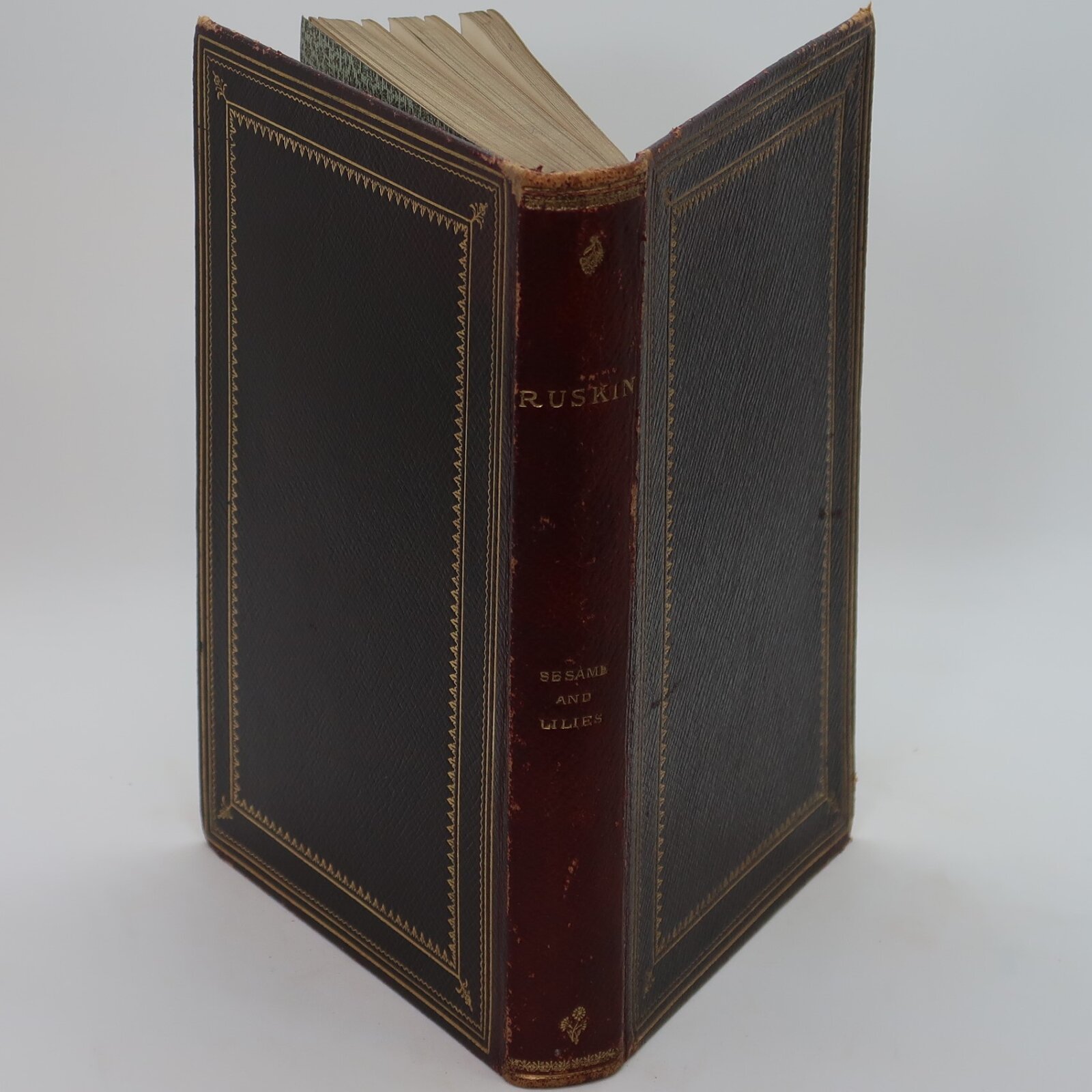 Brown leather bind with gilt title on the spine. Gilt edging pattern on both boards. All edges gilt.