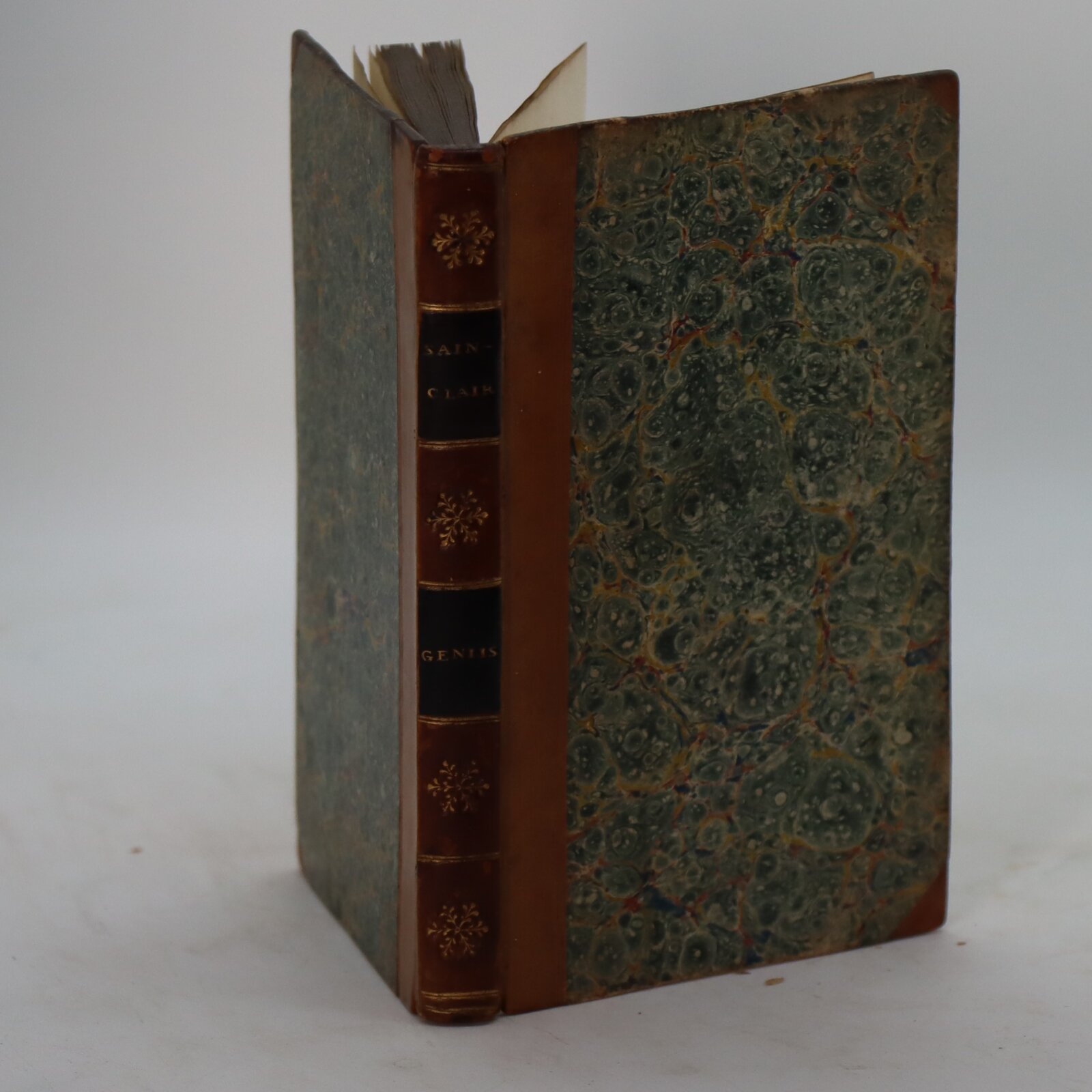 Tan calf spine with green marbled boards. Black title plates with gilt lettering and emblems.