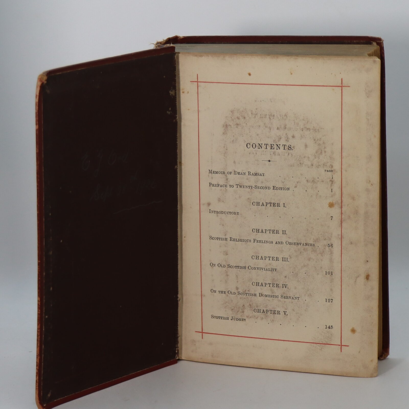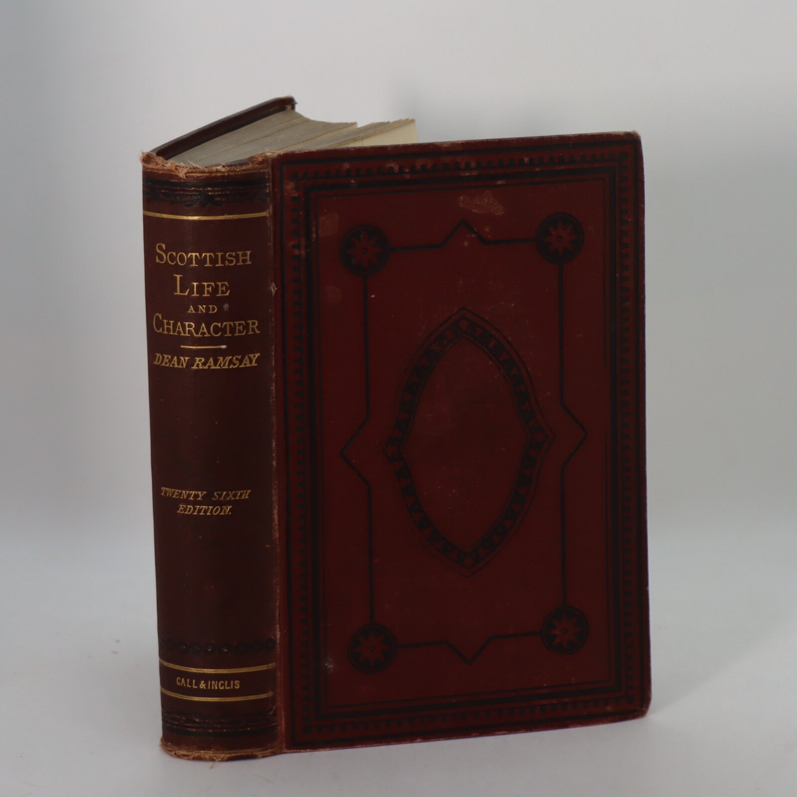 This edition, of the first 1857 edition of reminiscences of Scottish life and character printed on better paper and got up in a more expensive manner including new and piquant anecdotes and a celebrated Court of Session jeu dseprit reproduced in full as an appendix (editors note). The tipped- in coloured illustrations are entitled as follows: — The Kirk Collection. (Frontispiece). The Pillar O The Kirk. A Scottish Baptism. The Weavers Shop. The Weaver. The Shepherd. The Gravedigger. The Snuffer. A Guid Gangin Plea. A Lowland Cottage. The Mutch. The Bonnet Laird. The Beadle. His Day at the Plate. The Lairds Daughter. The Reader.