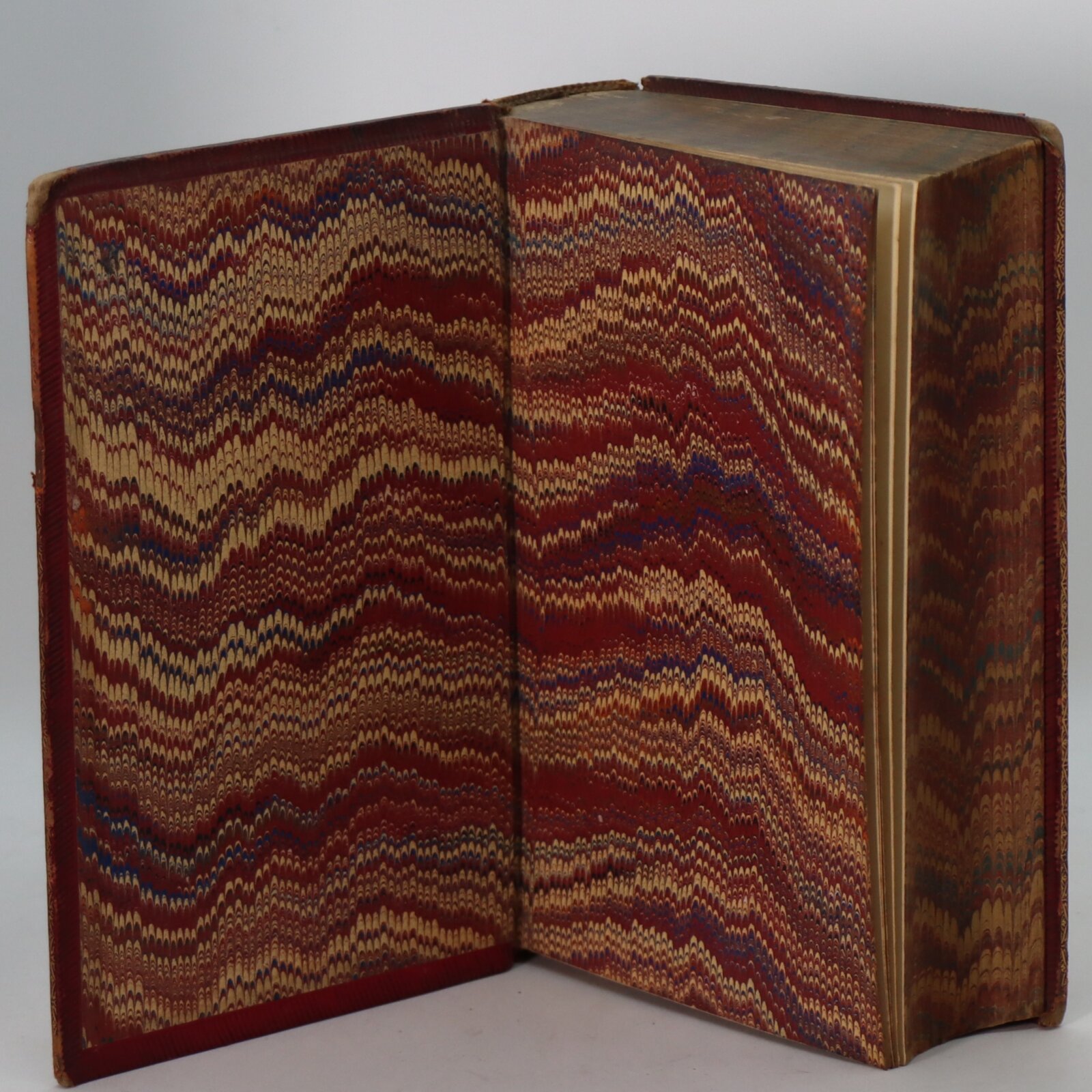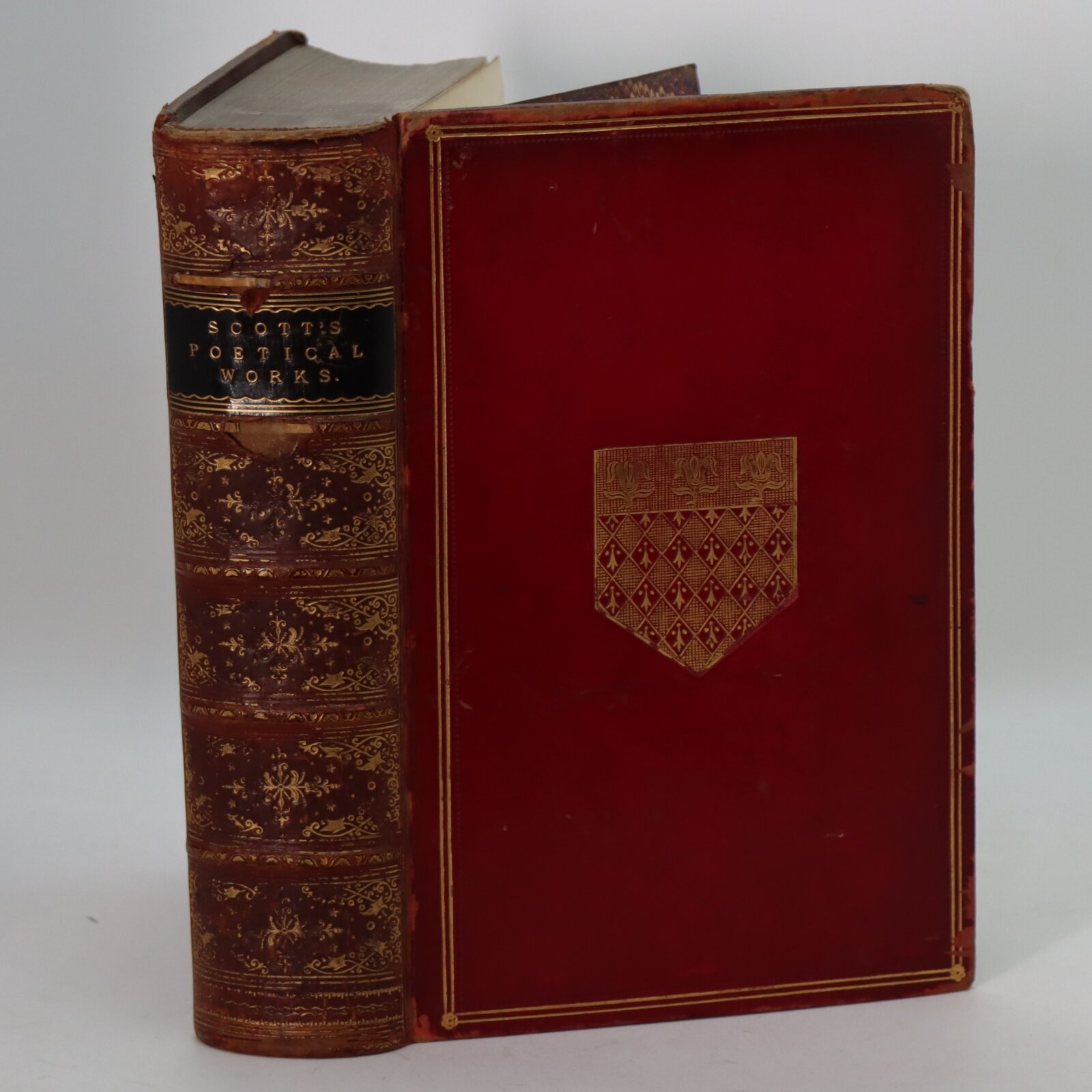 Red full leather binding with black title plate, raised banding and gilt decoration on the spine. Gilt edging and Magdalen college emblem on both boards.